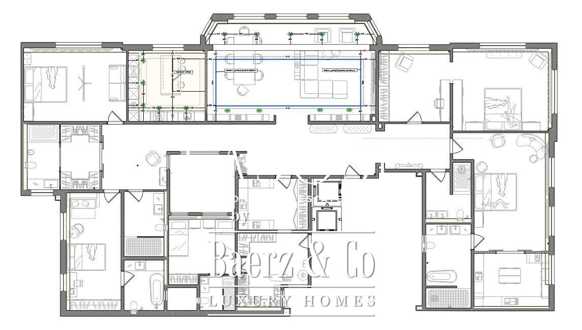 تم تصميم المساحة بحيث تحقق فصلاً واضحاً بين مناطق المعيشة والجزء الخاص من المنزل. توفر غرفة المعيشة وتناول الطعام الفسيحة إطلالة مفتوحة على توريو بارك، مع توازن بين الضوء الطبيعي والمناظر الخضراء الهادئة. تدعم المطبخ المنفصل نمط الحياة الأسرية الخاصة وكذلك المناسبات الاستثنائية. تضم الشقة خمس غرف نوم من بينها ثلاث غرف خارجية مغمورة بالضوء الطبيعي. ستة حمامات، أربعة منها كاملة واثنان ضمن الغرف، توفر الخصوصية والراحة للعائلة والضيوف.