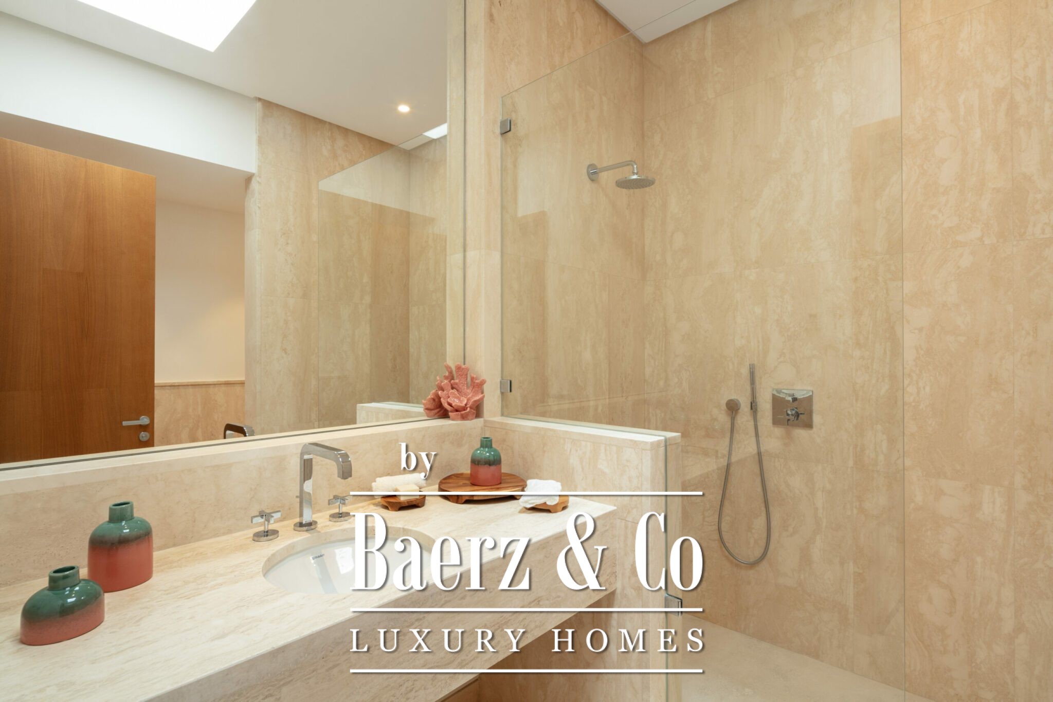 تم اختيار مواقع غرف النوم بعناية: اثنتان في الطابق الأرضي مع وصول مباشر إلى الحديقة، وأربع في الأعلى متصلة بممر يحمل ضوء النهار عبر النوافذ الواسعة. كل غرفة نوم تضم حماماً خاصاً مع إمكانية الوصول إلى الحدائق العلوية، بينما تمتاز الجناح الرئيسي بإطلالات طويلة وغير منقطعة.