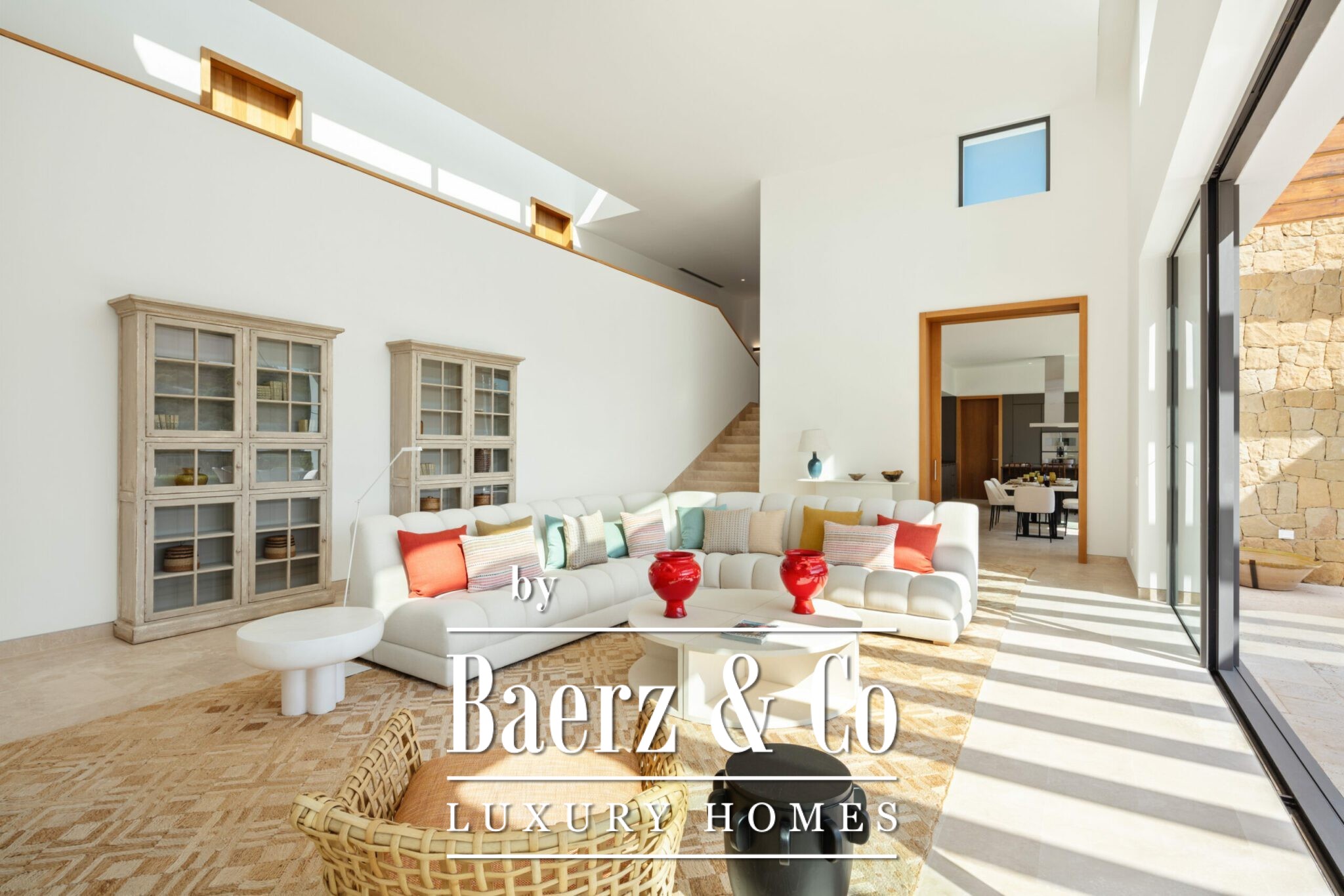 الطابق الأرضي يغمره الضوء الطبيعي من خلال الواجهات الزجاجية الواسعة، مما يعزز مساحة المعيشة ذات السقف المرتفع لتصبح مفتوحة وذات مستويات متعددة. منطقتا جلوس تتوزعان حول مدفأة مركزية، بينما ترتبط منطقة الطعام بمطبخ عصري الطراز يتميز بلوحات لونية محايدة ومساحات عمل واسعة. الوصول المباشر إلى التراس يسهل الانتقال إلى الطبيعة، مؤدياً إلى شرفات رحبة وحديقة بمساحة 1,837 م² مصممة بعناية. هنا، تعكس بركة السباحة الخاصة تبدلات السماء، مع مشهد مفتوح للمناظر الطبيعية المحيطة وملعب الغولف الأمامي.