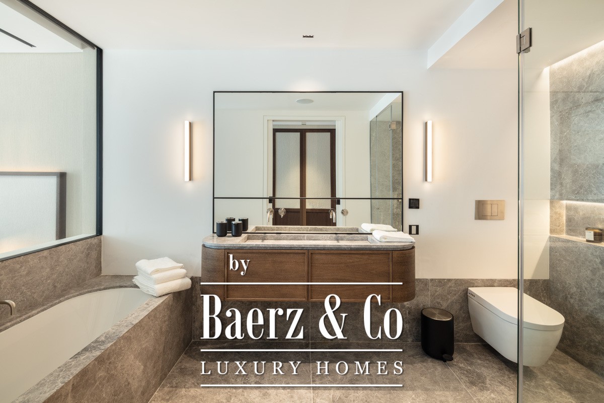 يتميز المطبخ بتشطيبات رخامية وتصميم أجهزة مخفية، ليوفّر مكانًا مثاليًا للترفيه الراقي والمعيشة اليومية السهلة. يمتد التراس الواسع المغطى مساحة المعيشة إلى الخارج لتناول الطعام والاسترخاء في الهواء الطلق، مع وصول مباشر من الجناح الرئيسي وغرفة المعيشة. كل واحدة من غرف النوم الثلاث تحتفظ بحمام خاص عالي الجودة بأرقى المواد. يوفر الجناح الرئيسي، مع حاجز زجاجي للخصوصية وحوض مزدوج من الحجر الرمادي، مساحة هادئة للراحة والهدوء.