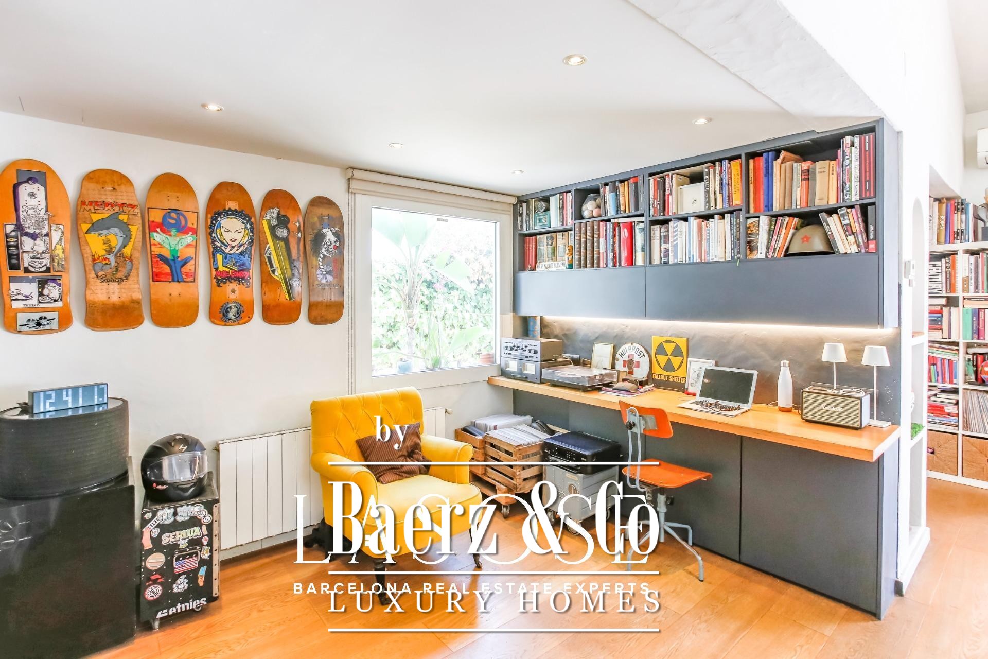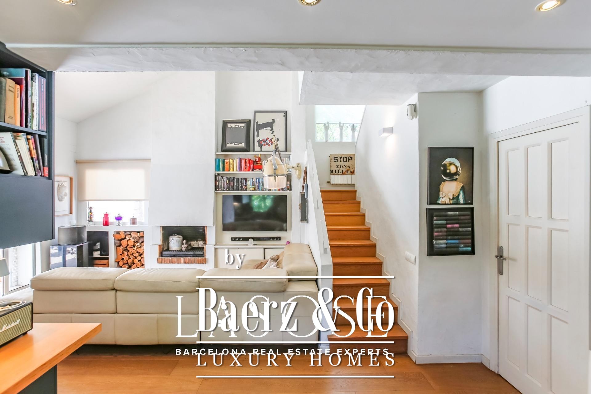 في الداخل، تتناغم المساحات بإيقاع مدروس؛ حيث تفتح غرفة المعيشة الأنيقة مع المدفأة مباشرة على الحديقة، بينما تتصل المطبخ المجهز بالكامل مع ركن عمل مركزي بفناء خاص وموقف للسيارات. في الطابق الأرضي، توجد جناح للضيوف أو غرفة دراسة مخصصة توفر مرونة المعيشة، أما الطابق العلوي فيضم ثلاث غرف نوم مزدوجة مشرقة تطل كل منها على الحدائق وتتمتع بأسقف عالية ذات مستويين. يبرز الطابع الراقي من خلال التشطيبات المتقنة والألوان الحيادية التي تعزز أناقة العمارة الطبيعية.
