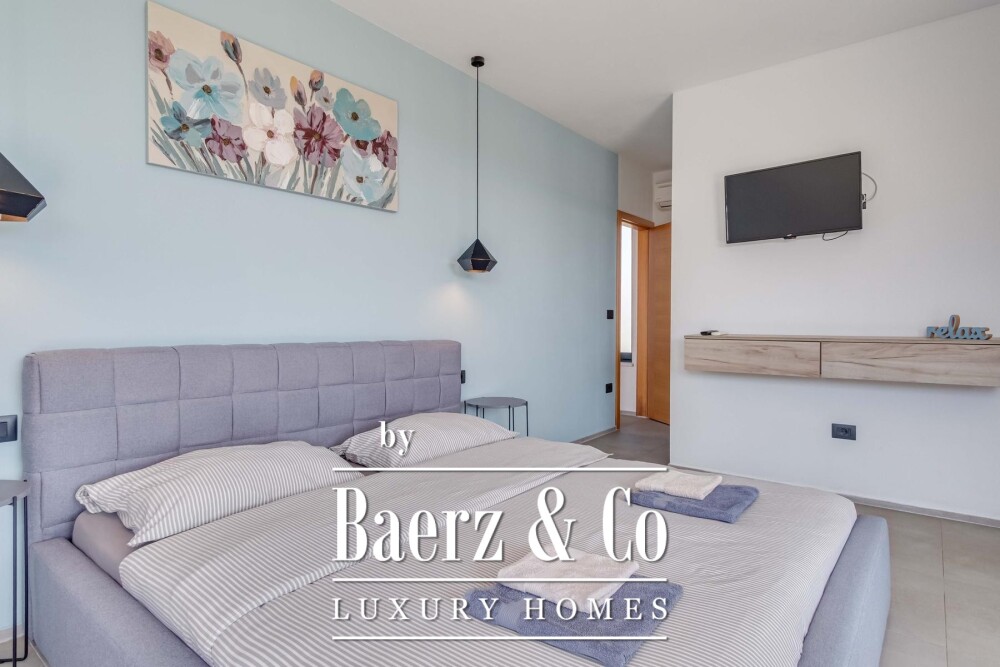 عند الصعود بسلم حديث إلى الطابق العلوي، يجد السكان ثلاث غرف نوم إضافية، كل منها مزود بحمام منفصل، واثنتان منها تحتويان على حوض استحمام داخل الغرفة، إحداهما مزودة بميزة التدليك المائي وأخرى بحوض استحمام منفصل. جميع غرف النوم في الطابق العلوي تفتح على تراس مغطى بمساحة 28 م² وتراس شمسي مستوٍ على السطح بمساحة 31 م²، ليحظى الساكنون بإطلالات بانورامية على البحر الأدرياتيكي.
