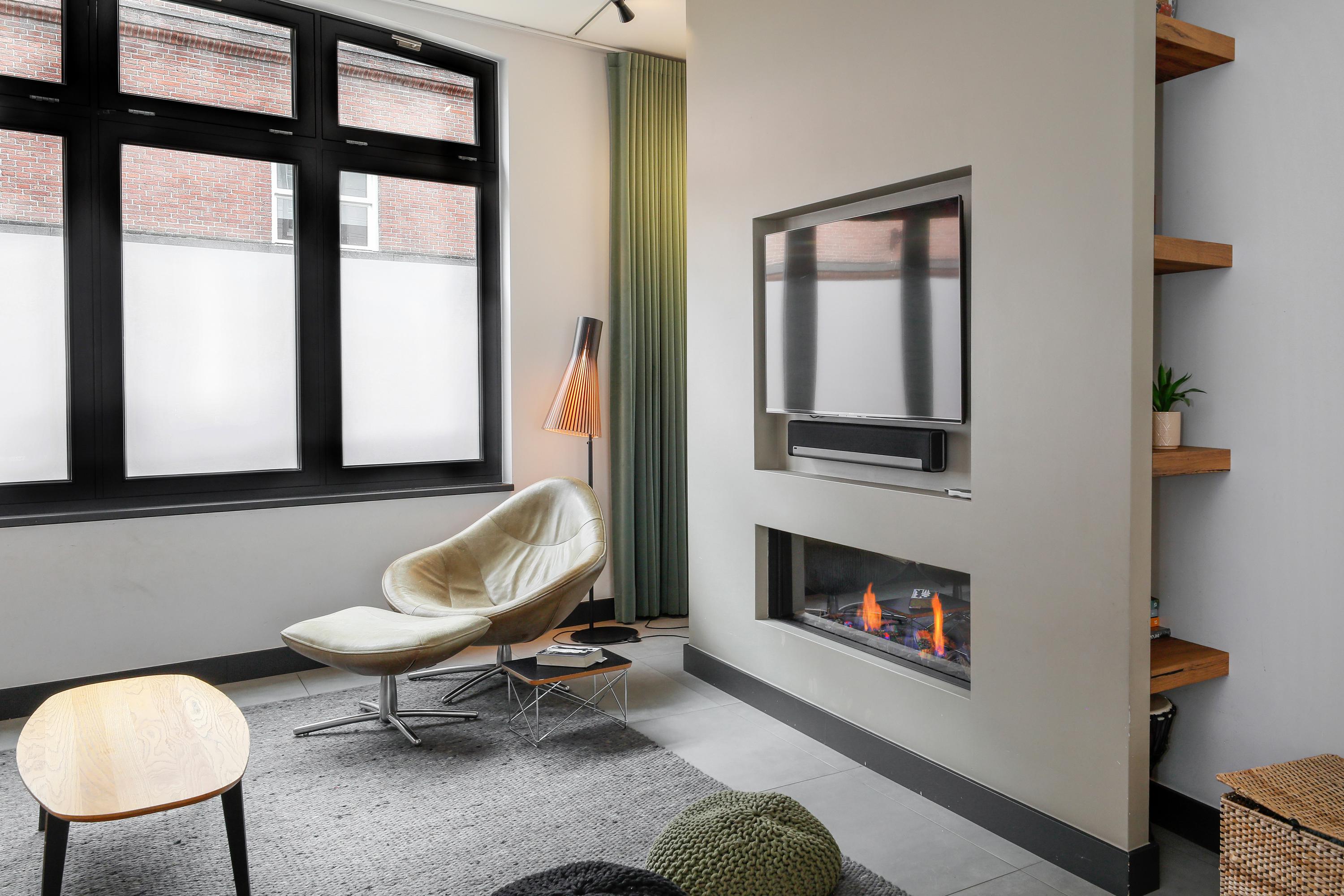 It's especially nice when the sitting area is at the end of the room. Here, you can find peace and quiet in the evenings, without the hustle and bustle. The fireplace is incorporated into a wall, as is the TV. Behind this wall, there's plenty of storage, with shelves providing ample space for displaying beautiful items. Just like the rest of the ground floor, the tiled floor resembles a wooden one. This floor not only creates a warm atmosphere, but thanks to the underfloor heating, it's also very comfortable for bare feet. A large arched window provides ample natural light.