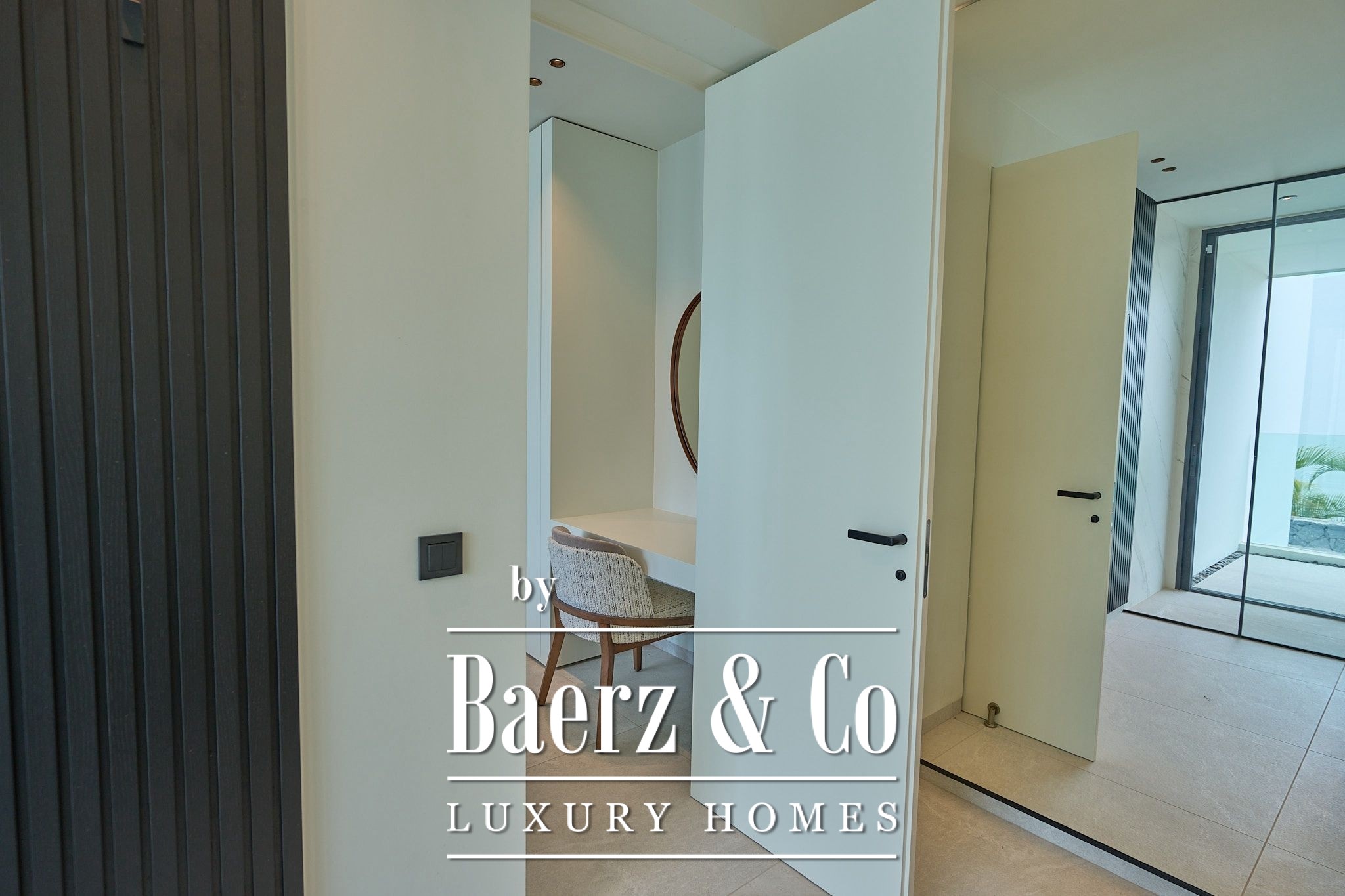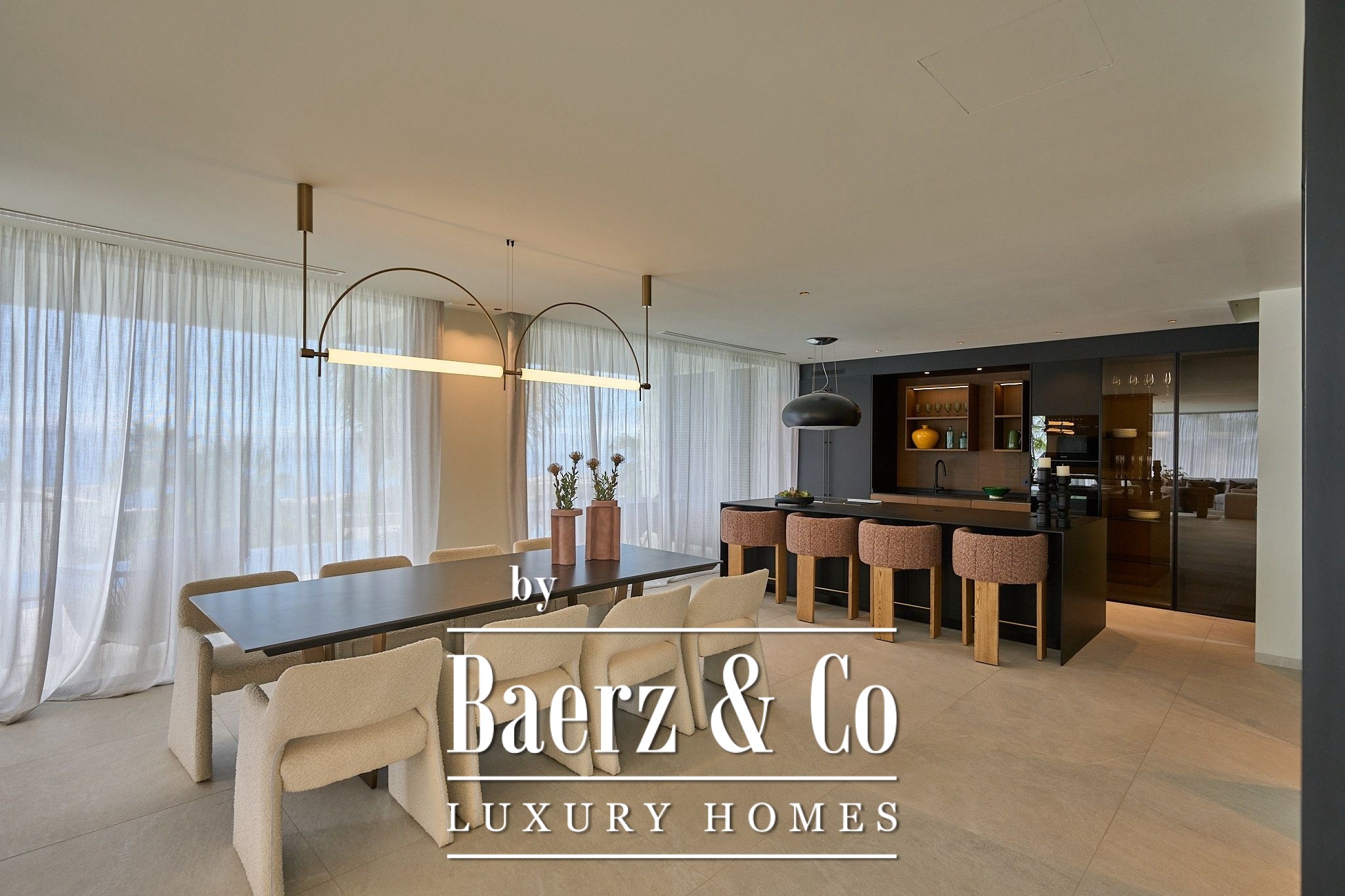 The villa features four en-suite bedrooms, each with built-in wardrobes and private access to lush tropical gardens that elevate the sense of space and tranquility. Upstairs, the spacious living and dining area flows naturally into a modern, fully equipped kitchen complemented by a climate-controlled wine cellar, while expansive windows amplify natural light and connect seamlessly to the exterior.
