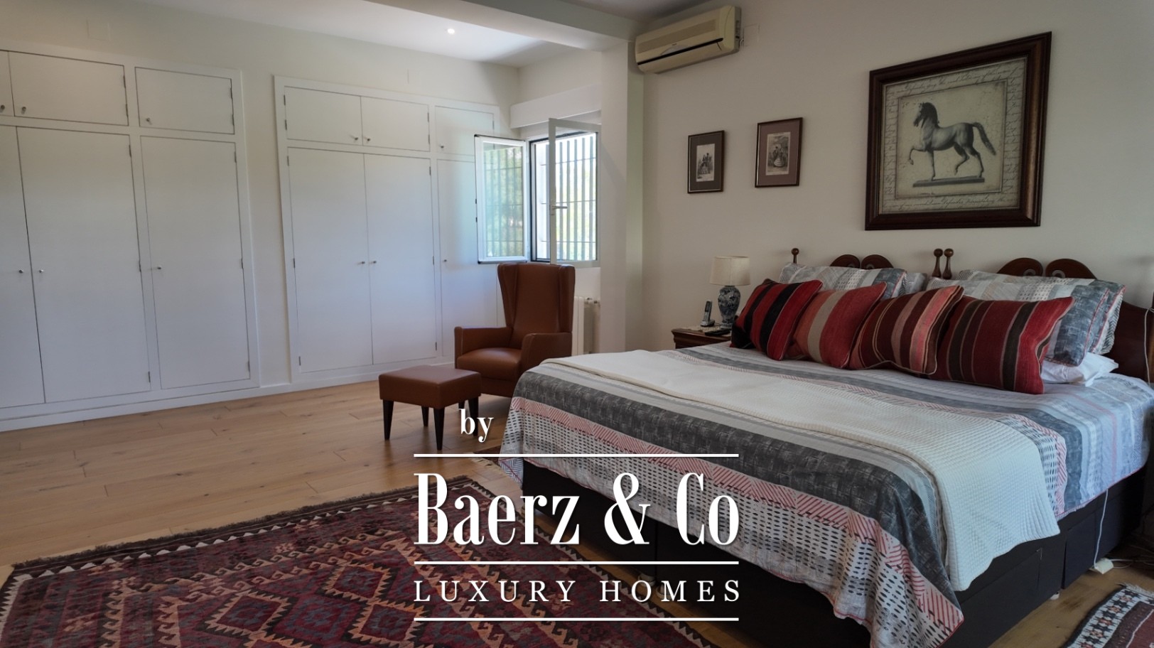 Landscaped grounds are designed for effortless enjoyment, featuring a saltwater pool with pre-installed heating, spacious terraces, and a fully equipped summer kitchen. A double garage, air conditioning, central gas heating, solar panels with batteries, Scandinavian oak flooring, security features, and water softening systems contribute to both comfort and efficiency.