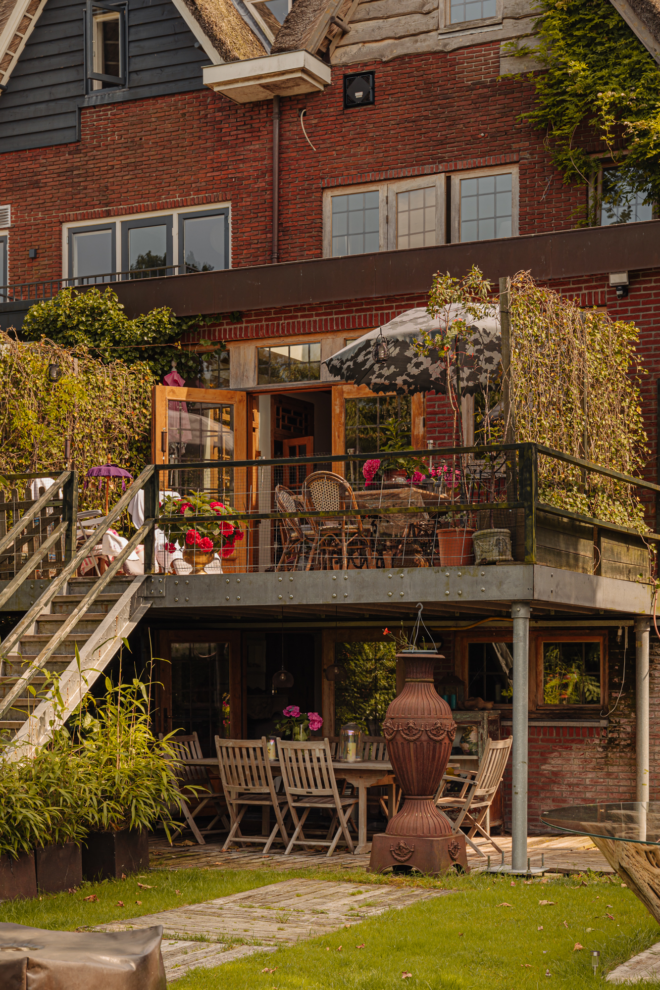 Distinctive features include four open fireplaces, handmade oak doors, and a thatched, insulated roof. The semi detached house Amstelveen invites versatile living, with space for family, flexible work arrangements, or hospitality. Outside, the vast garden and terraces offer rare privacy, with direct access to a private mooring on the Amstel. This is a home where tranquility, architectural detail, and access to both city amenities and nature converge with confidence.