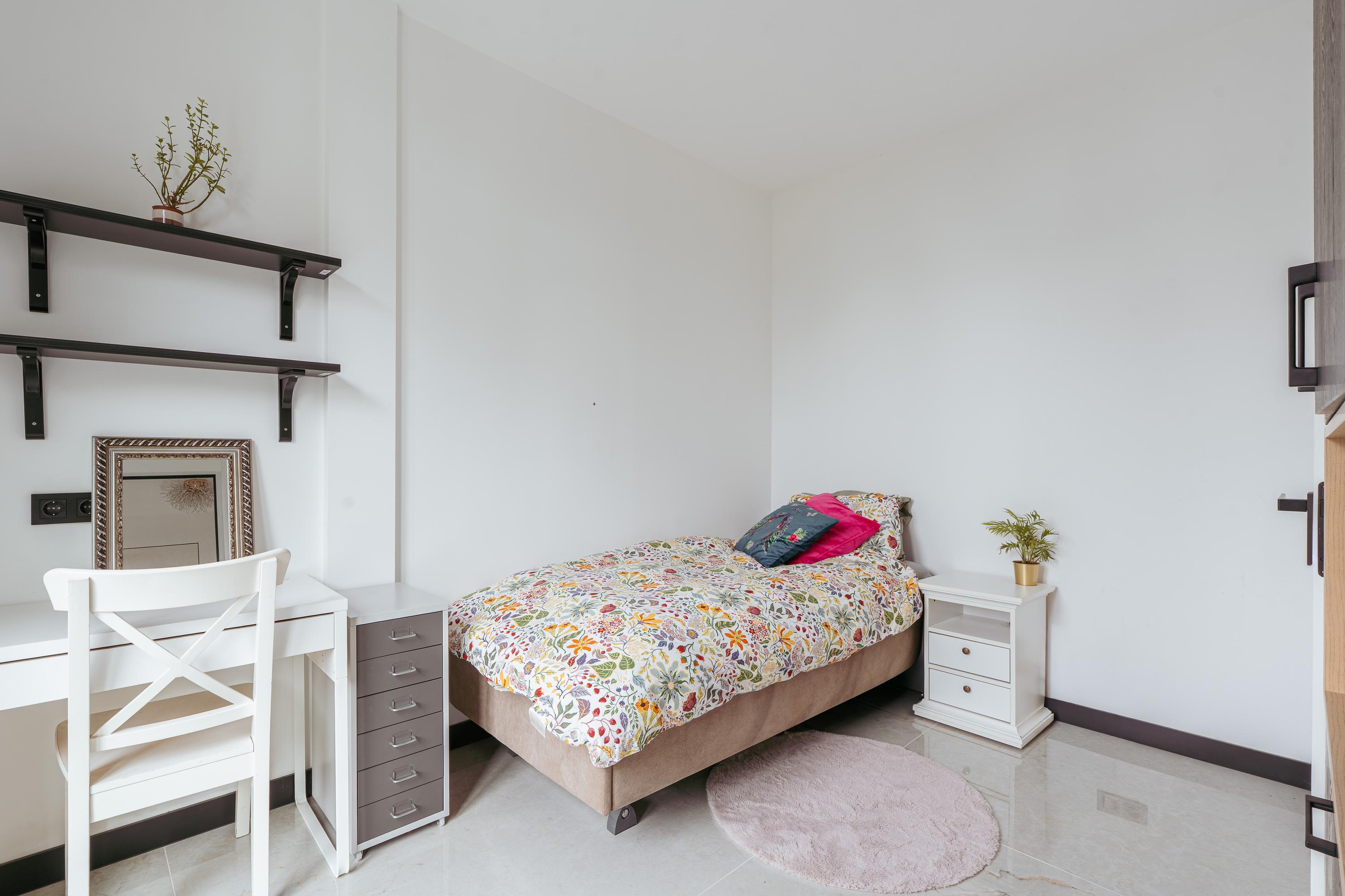 The first floor comprises three well-proportioned bedrooms, all with direct access to a south-facing balcony. The bathroom on this floor is fully fitted and features a bathtub, walk-in shower, double washbasin with vanity unit, and a toilet. In addition, there is a separate laundry room on this level.