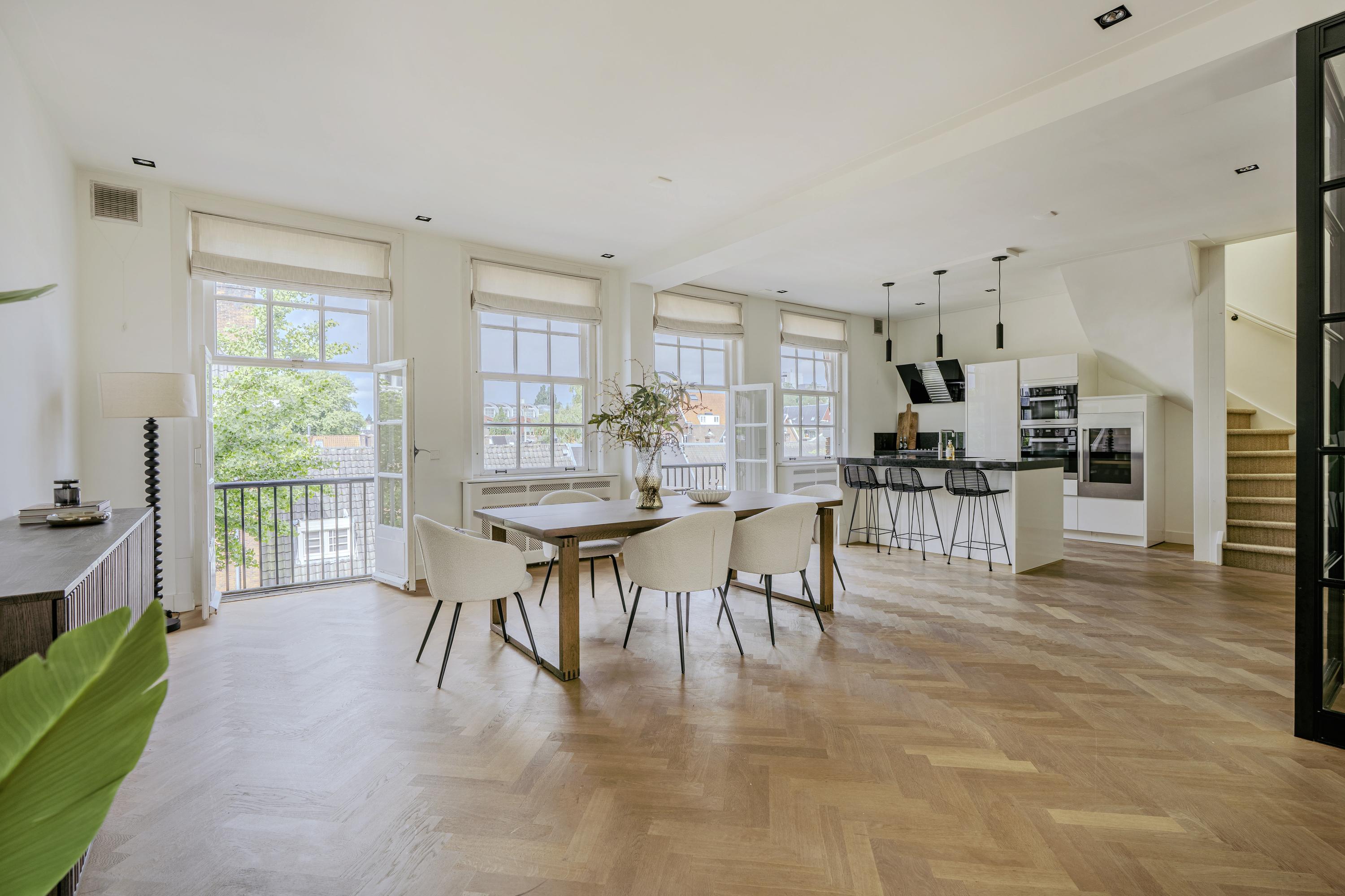 Stylishly finished and exceptionally bright double upper-level apartment (approx. 163m²) with a spacious roof terrace, two balconies, luxury kitchen, and atmospheric living room in a prime location in Amsterdam-Zuid!