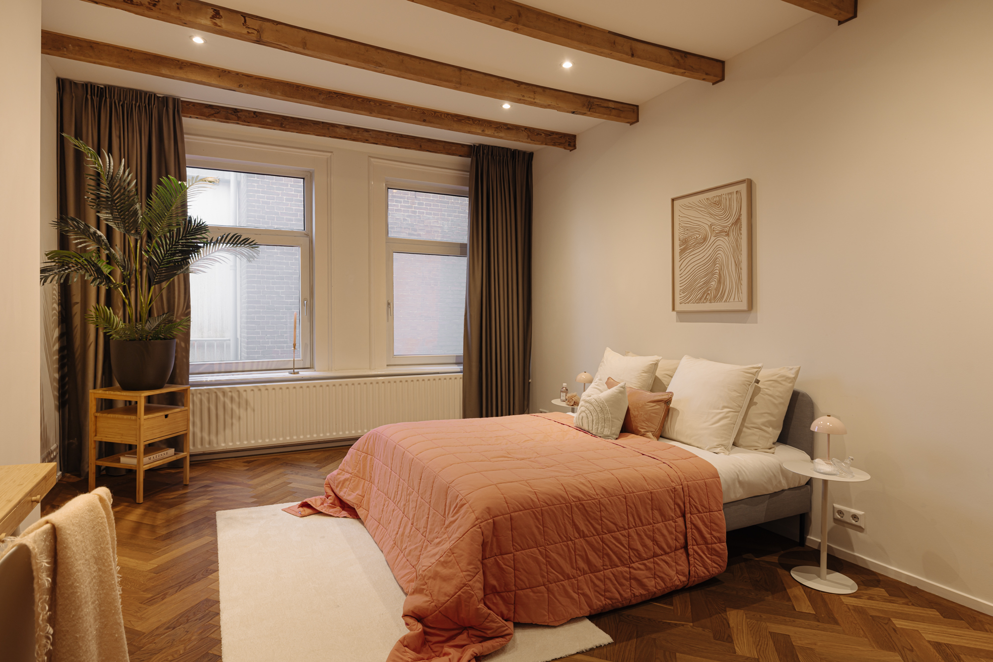The entrance is located on the ground floor. Upon entering, you step into a beautifully designed hallway where the character and refined style of the home immediately become visible. The high ceilings, warm tones, thoughtful lighting, ceiling ornaments and classic details create a welcoming atmosphere that almost makes you forget you are in the centre of the city.