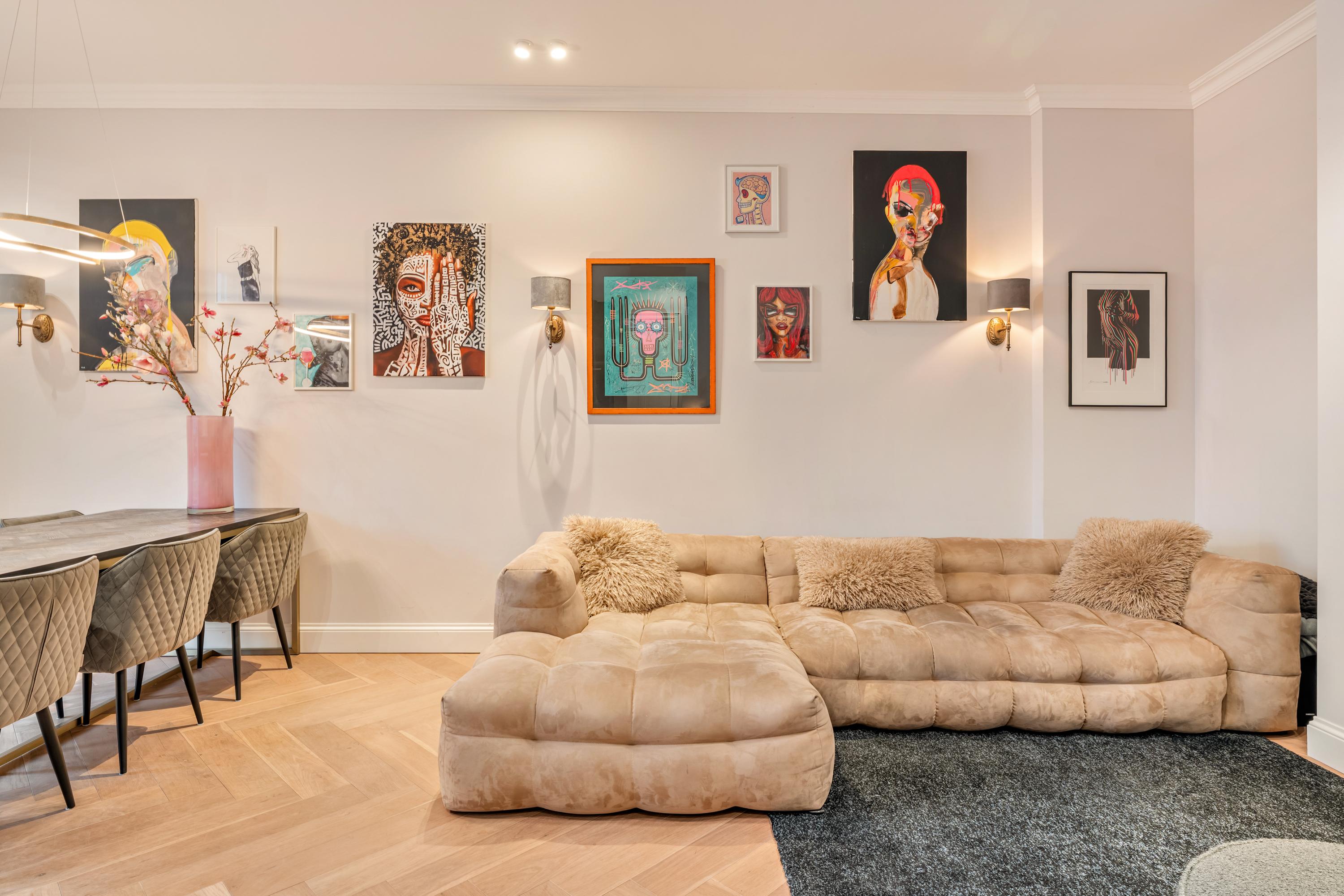 No expense has been spared during the renovation, with high-quality materials used throughout the luxurious finishes. The entire apartment features an oak herringbone floor with underfloor heating and elegant high skirting boards. All rooms are fitted with recessed spotlights, wall lighting, and decorative mouldings.