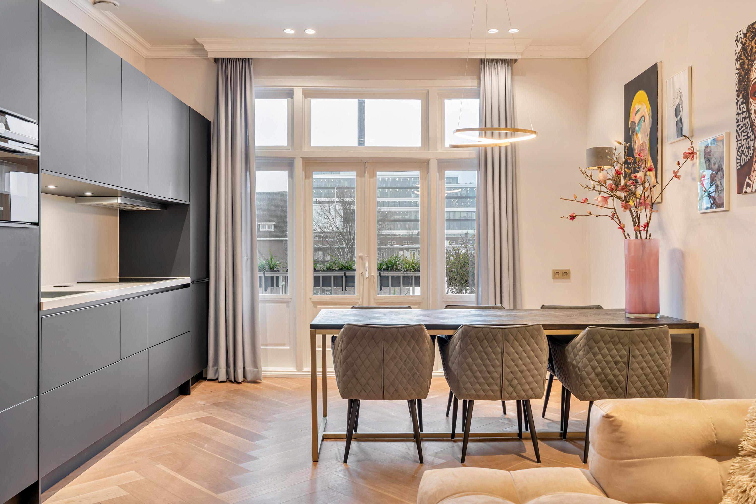 Fully renovated, high-end apartment of approximately 82 m², featuring high ceilings (3.16 m), three bedrooms, a luxurious bathroom, a sunny balcony, and a well-proportioned rooftop terrace (approx. 33 m²) complete with an outdoor kitchen and outdoor bath. The apartment is situated in a well-maintained building, which was redivided in 2023, in one of the most desirable locations along the Amstel.