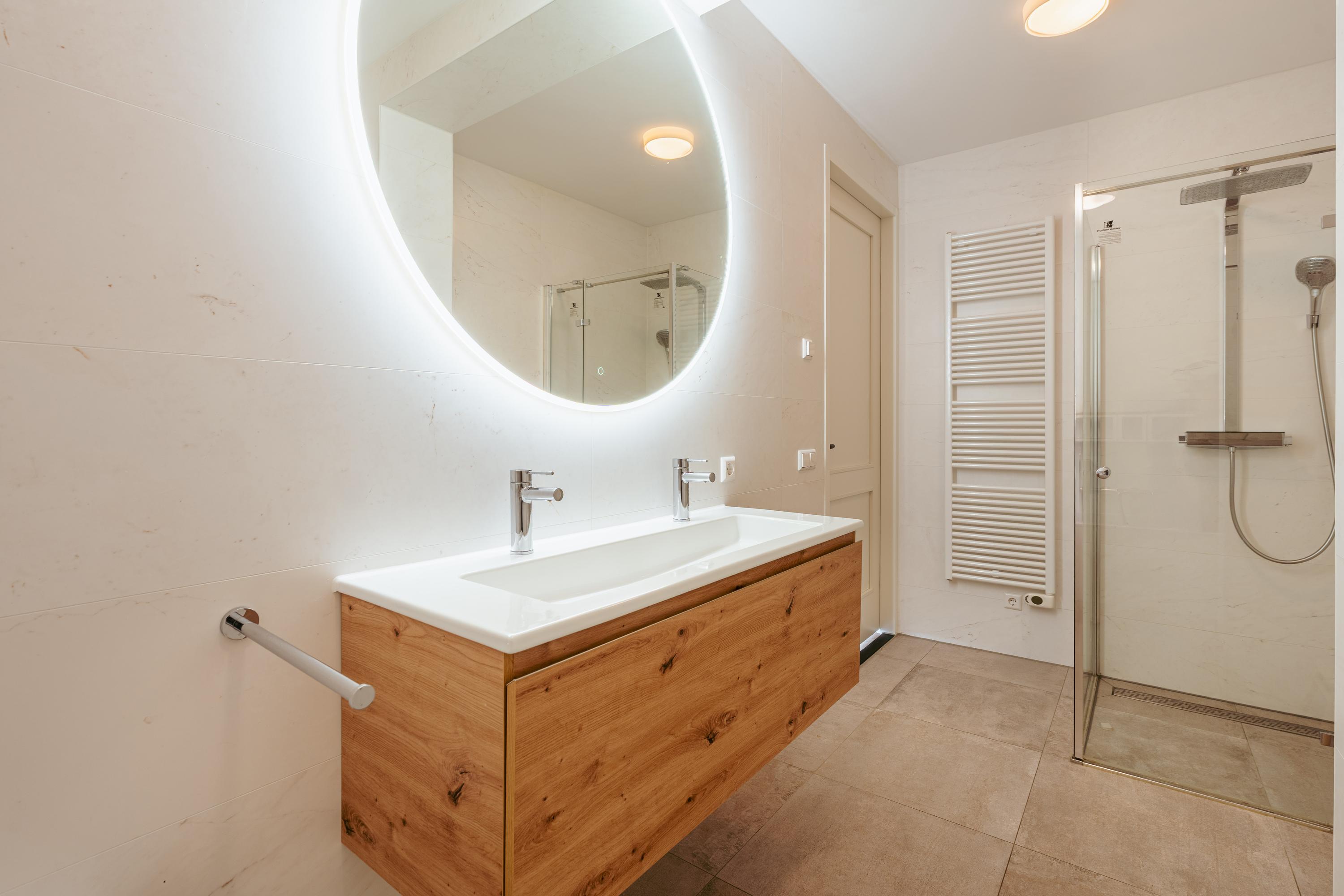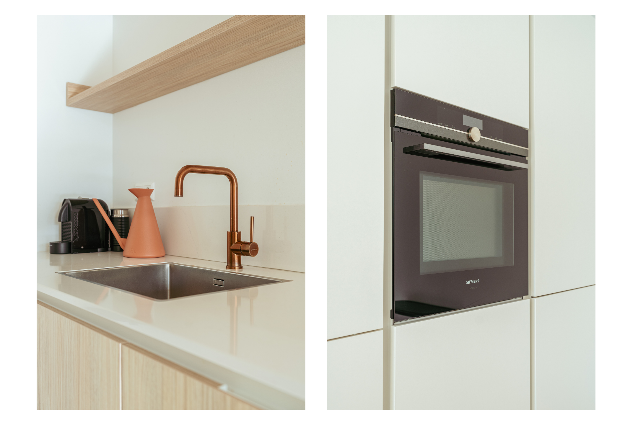 Through the well-maintained entrance of the complex, you reach the fifth floor by lift or stairs. The hallway includes a separate toilet with washbasin and a spacious storage room containing the heat pump and the necessary connections for a washing machine and dryer. From here you have access to all rooms. The generous primary bedroom is located at the front. Impressive windows allow for an abundance of natural light. Adjacent is the spacious living room. A large sliding door provides access to the south-facing terrace. The open-plan kitchen is fully equipped with all modern built-in appliances, including an induction cooktop, dishwasher, fridge-freezer, and combination oven. There is more than enough storage space.