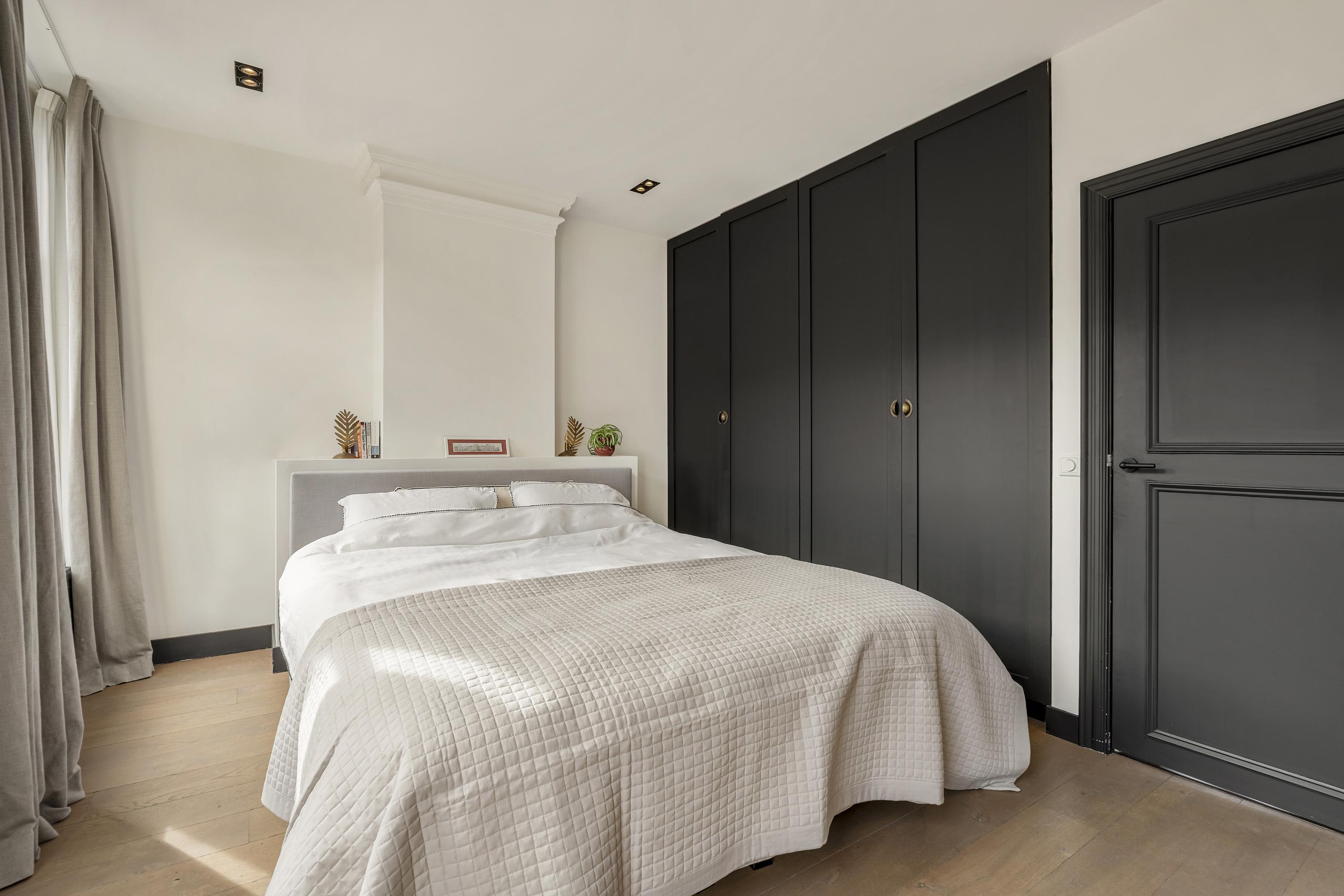 The living floor, situated on the fourth level, features a spacious and bright living room with an open-plan kitchen. The space is characterized by charming wooden beams, adding warmth and character. Large windows at both the front and rear, combined with natural light from the rooftop terrace, ensure a pleasant flow of daylight throughout the day. The open kitchen spans the full width of the wall and offers ample storage space. It is equipped with a six-burner gas stove, extractor hood, oven, dishwasher, sink with Quooker, refrigerator, freezer, and a wine climate cabinet. This floor also includes a separate toilet with double doors. From the living room, there is direct access to the west-facing balcony at the rear. A fixed staircase leads to the stunning rooftop terrace. This generous outdoor space offers complete privacy and enjoys 360-degree sun exposure, making it the perfect place to relax throughout the day. With ample room for multiple seating and lounge areas, the terrace is a true highlight of the property.