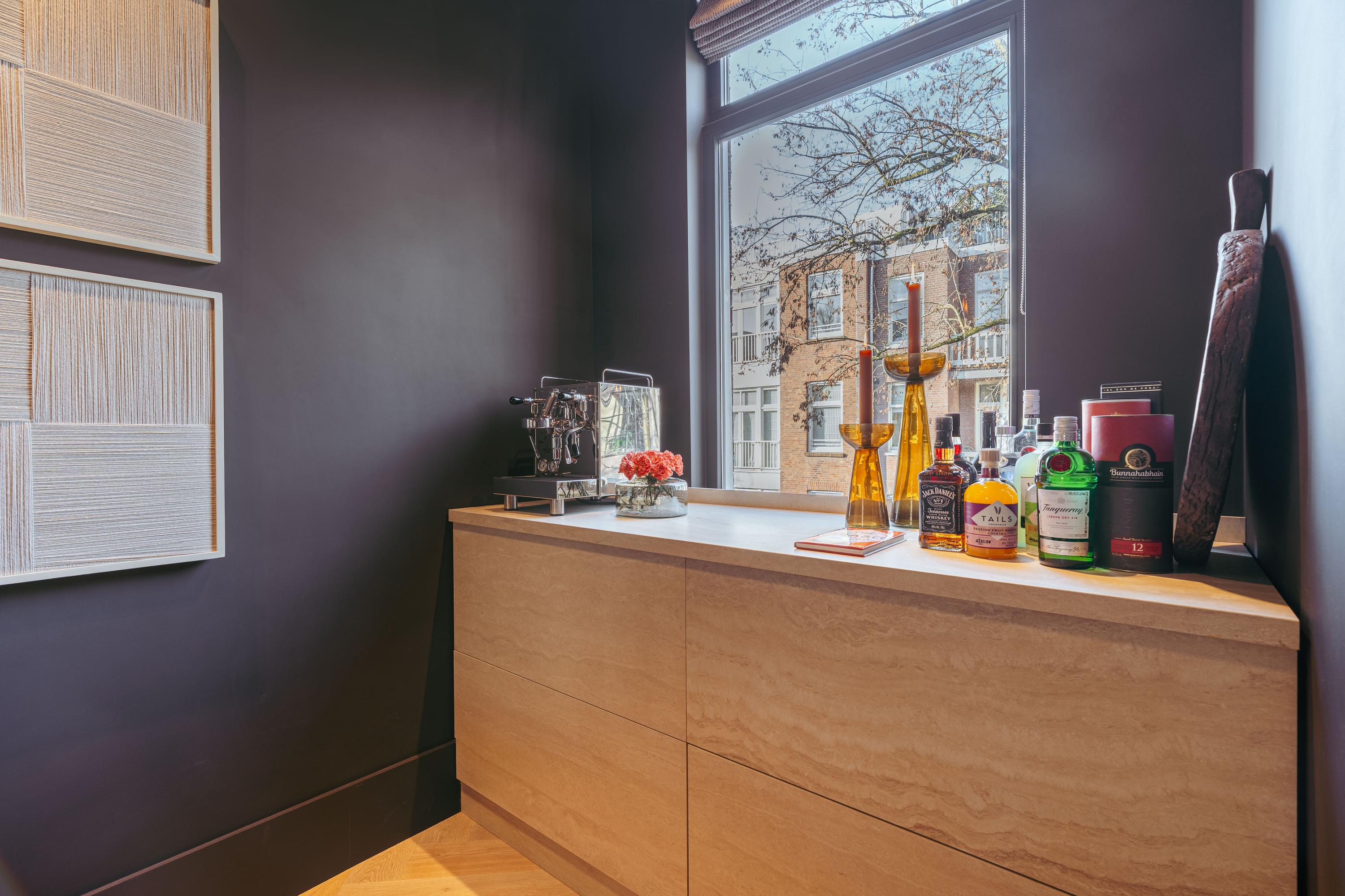 Via the private entrance, you reach the first floor, where a staircase leads to the main living level on the second floor. On the landing you will find a built-in wardrobe and a separate toilet, after which you enter the spacious living and dining area. The living room extends from the front to the rear of the property and is flooded with natural light at the front thanks to the large windows. At the front there is also a stylish home office area with a custom-built desk, an ideal place to work or study in peace. French doors open onto a balcony overlooking the charming Johannes Verhulststraat.