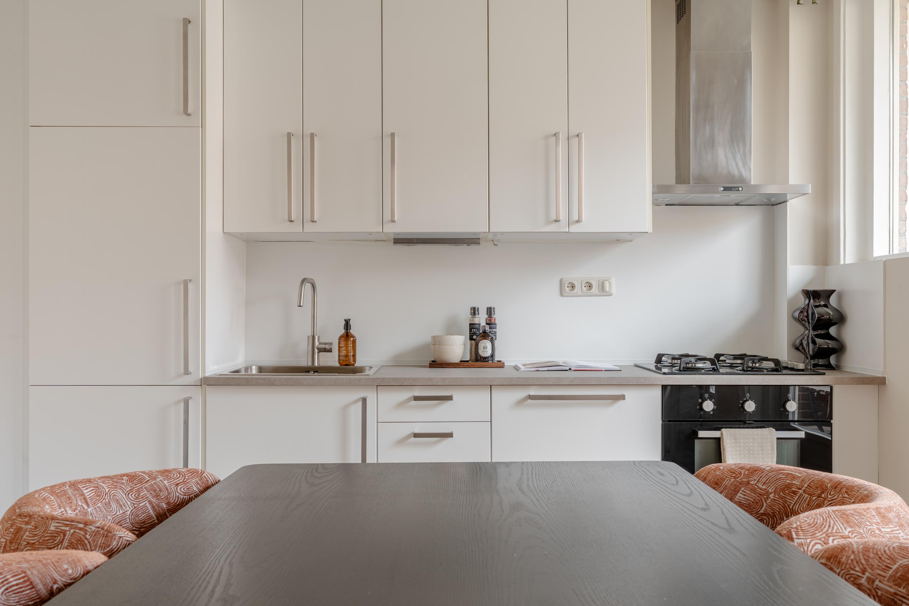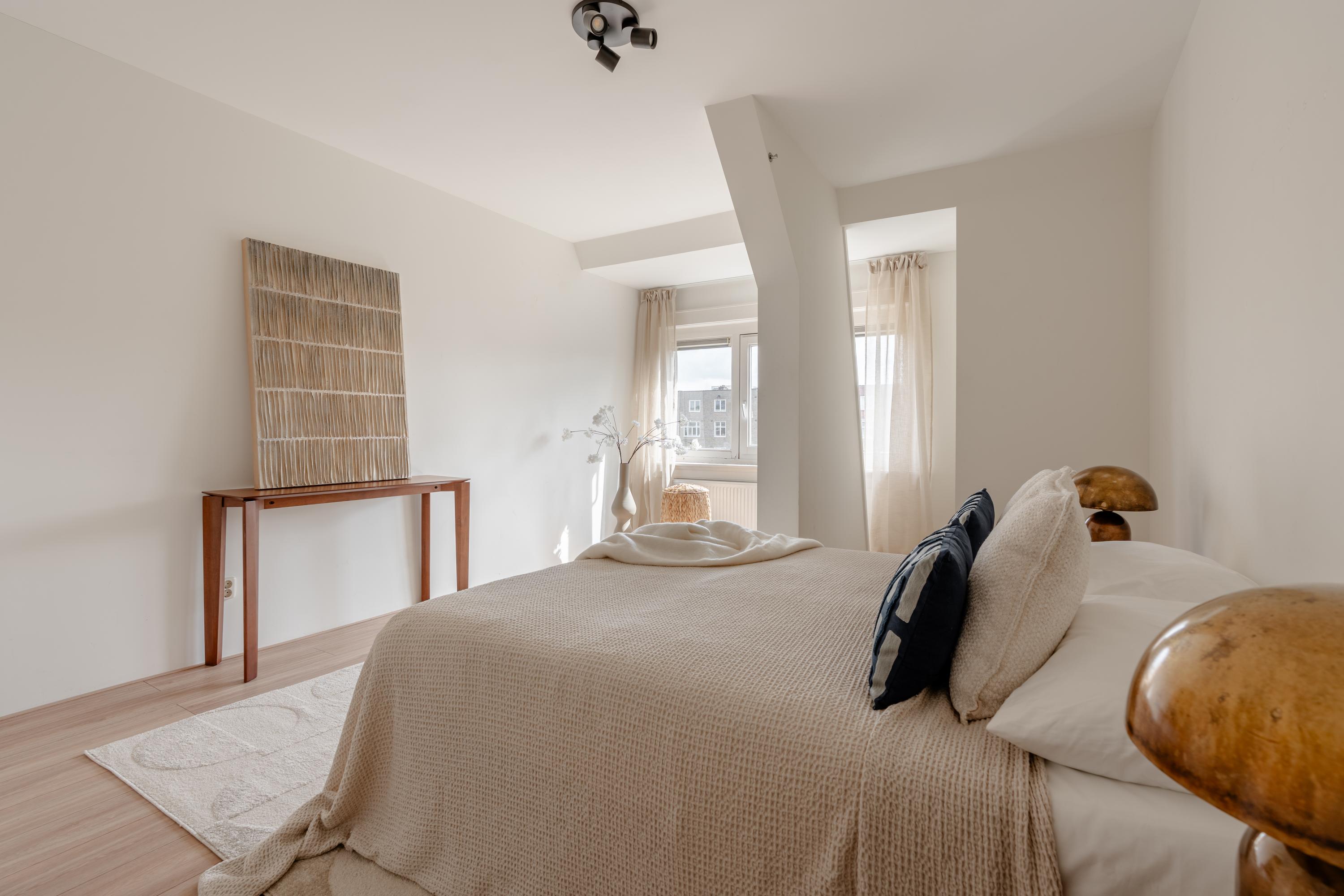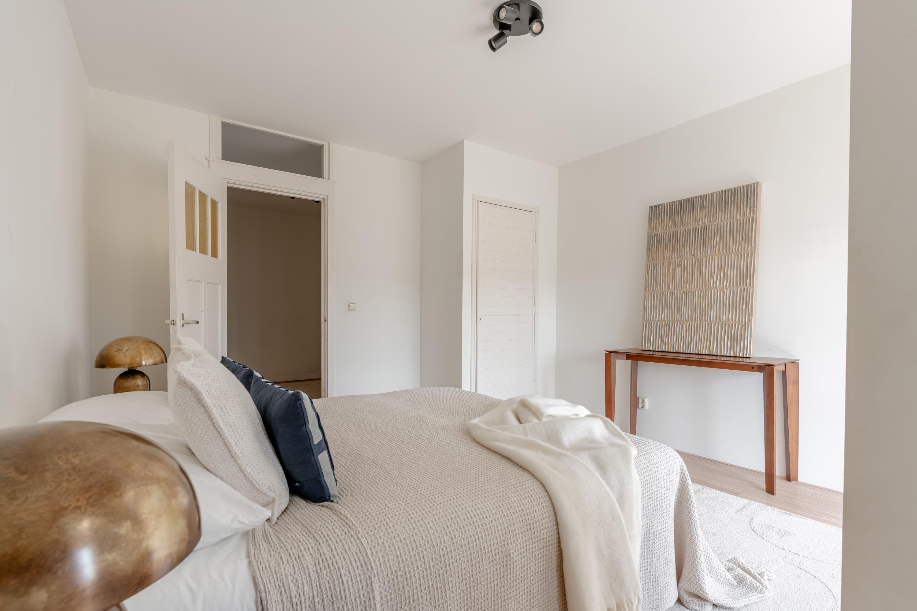 The living room at the front offers ample space to create a comfortable seating area. The charming bay window with opening windows allows for plenty of natural light and offers pleasant views over Jozef Israelskade and the water. At the rear, you will find the kitchen, situated in a pleasant open space yet separate from the living room. This makes it an ideal place to cook in peace and enjoy dining. Thanks to the three sets of French doors opening onto the balcony, this area is exceptionally bright. The kitchen is fully equipped, including a refrigerator, freezer, dishwasher, and a four-burner gas stove. The wide balcony, facing northwest, overlooks the quiet inner courtyard and provides a lovely place to relax. Adjacent to the kitchen is a bedroom that also has access to the balcony. This room can be flexibly arranged, for example as a home office, study, or children's room. The bathroom is also located on this level and features a bathtub, toilet, walk-in shower, and washbasin.