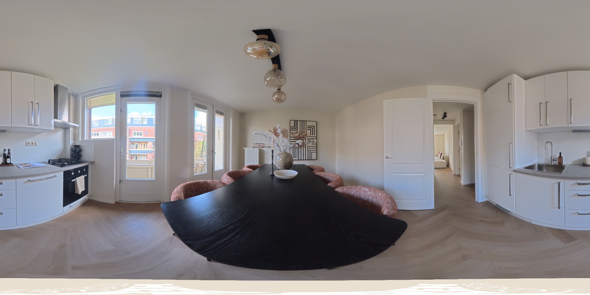 Via the communal staircase, you reach the apartment on the second floor, where the first level of the property is located. You enter a central hallway that provides access to all rooms. The apartment is neatly and stylishly finished, with well-maintained flooring and wall finishes.