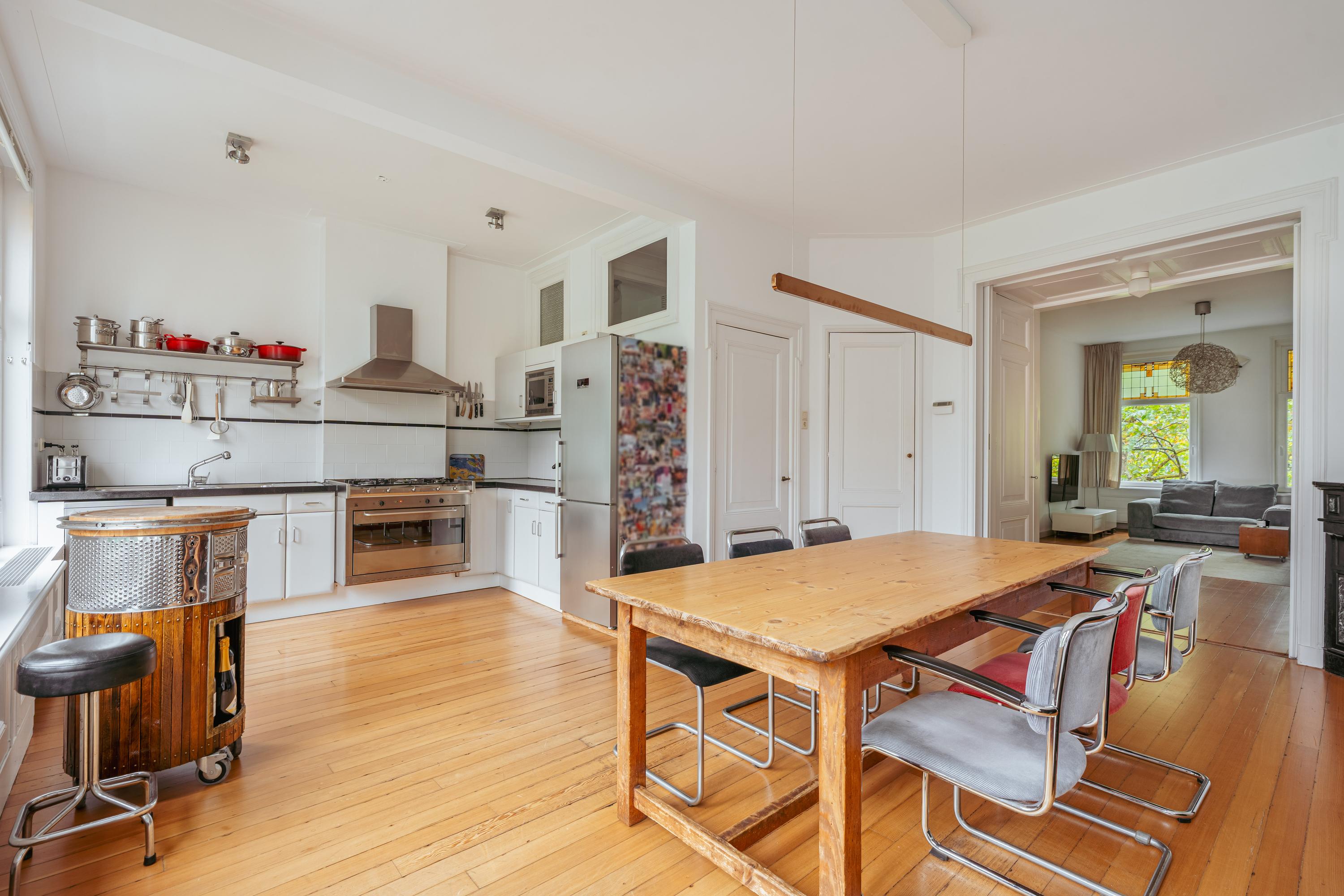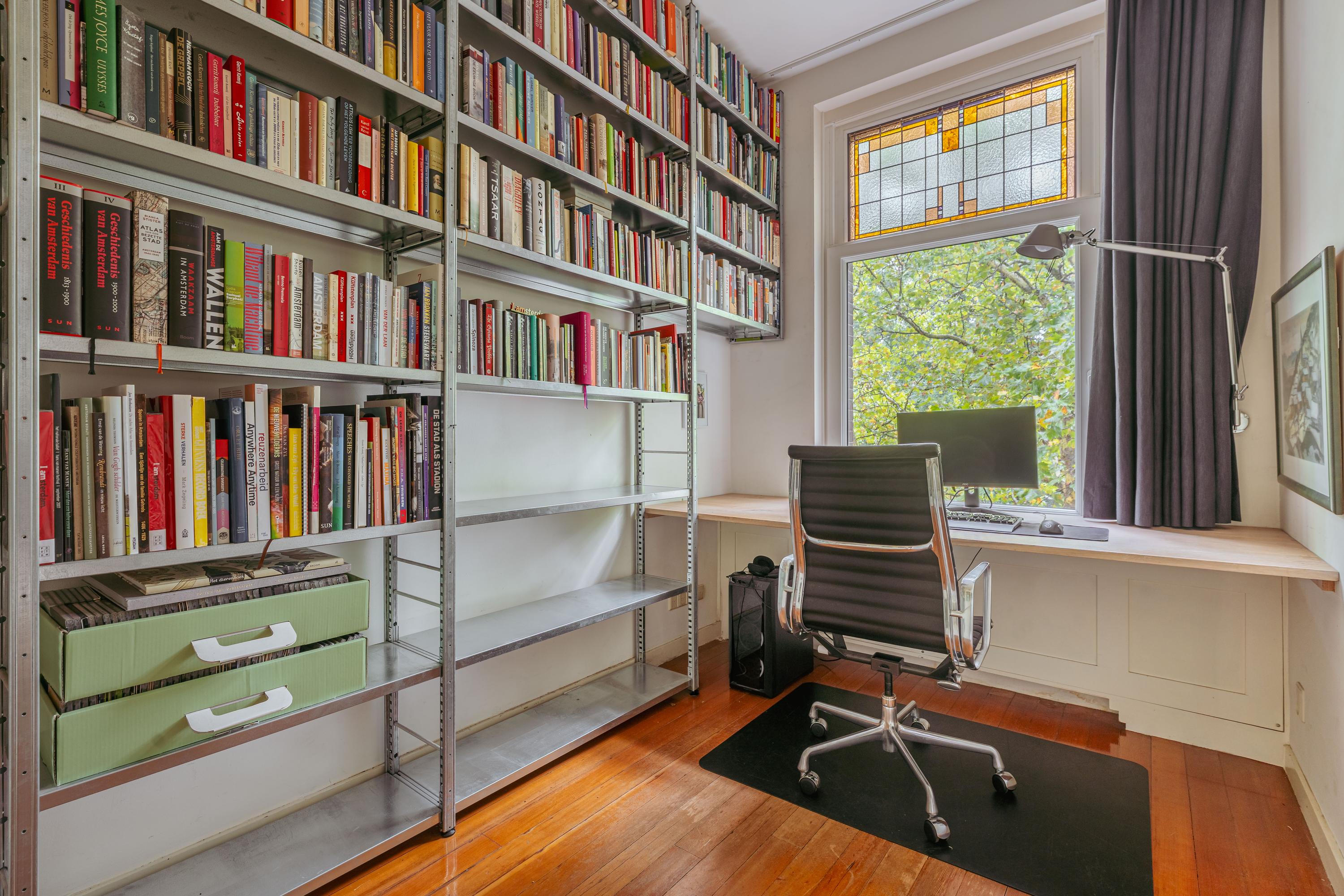 This entire floor is characterized by high ceilings, wooden flooring, and large windows with stained-glass details. At the front, the living room spans the full width of the house and overlooks the green of the Sarphatipark. The abundance of natural light and the generous layout give this space a calm and inviting feel.