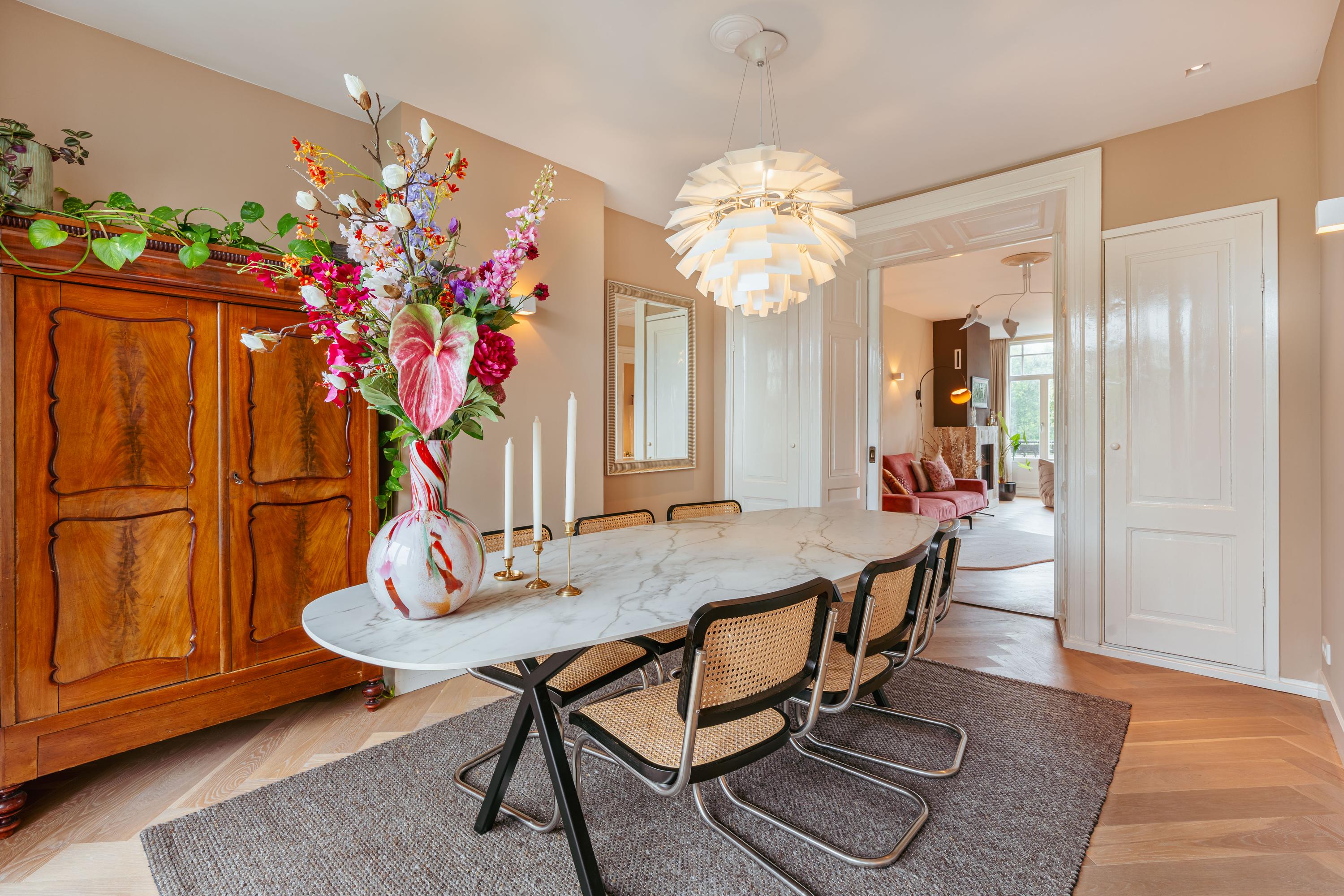 Original wooden en-suite doors connect the living room to the dining area at the rear, where another balcony lets you enjoy the morning sun as early as 7:30 a.m. The adjoining modern kitchen features a fresh design with white cabinets and a large worktop. Fully equipped with high-end appliances including a Quooker, combi-oven, dishwasher, five-burner gas hob, fridge-freezer, and double sink, it is an ideal space for cooking enthusiasts and those who love to host.