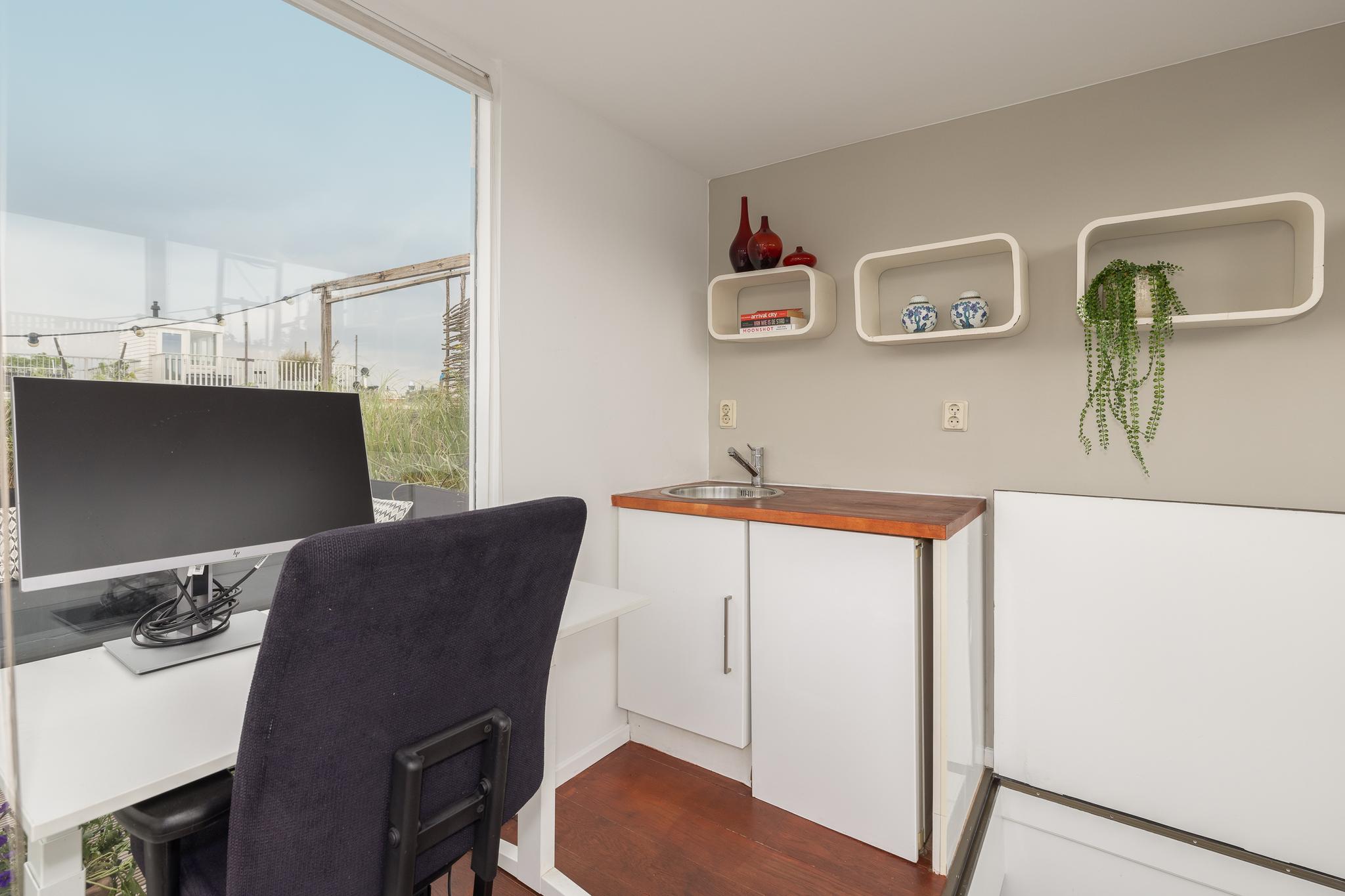 Here you get access to the very spacious, cozy, and beautifully finished roof terrace. On this floor, you also have a sink and cooling at your disposal. It is also convenient that the access to the roof house can be closed off, creating a nice space of about 6m². In short, enough space to create a home gym, for example for practicing yoga, or a wonderful home office.