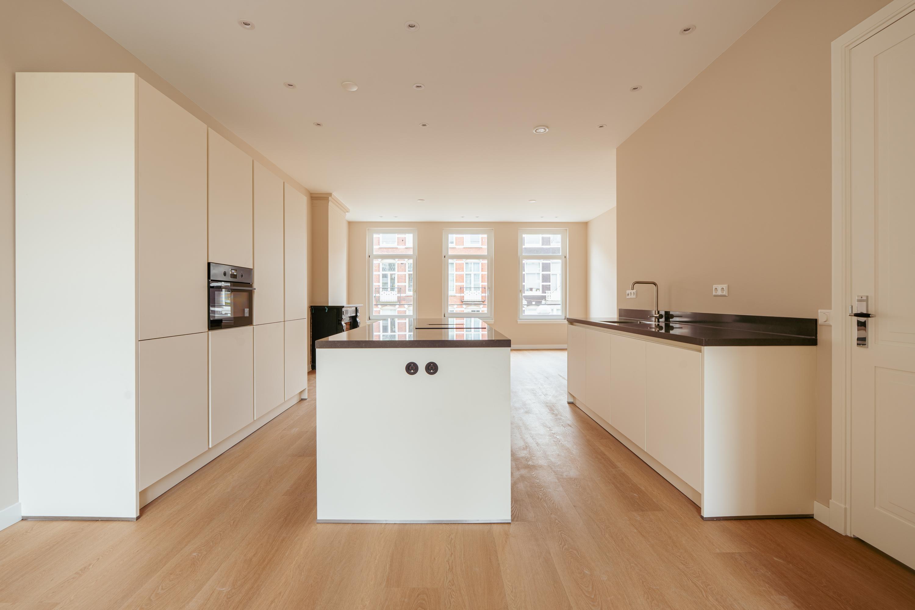 Via de overloop, waar zich een separaat gastentoilet bevindt, zijn alle vertrekken op deze verdieping toegankelijk. Aan de linkerzijde bevinden zich twee goed bemeten slaapkamers. Aan de rechterzijde ligt de royale doorzonwoonkamer, die dankzij de grote raampartijen rijkelijk wordt overspoeld met daglicht. De stijlvolle open keuken is uitgevoerd in een strak en luxe design en uitgerust met alle denkbare inbouwapparatuur, waaronder een kookeiland, combi-oven, vaatwasser, koel-vriescombinatie en volop bergruimte. De originele schouw voegt een warm, authentiek accent toe aan het geheel. Via openslaande deuren heeft u toegang tot het dakterras (ca. 32 m²): een heerlijke plek om buiten te ontspannen.