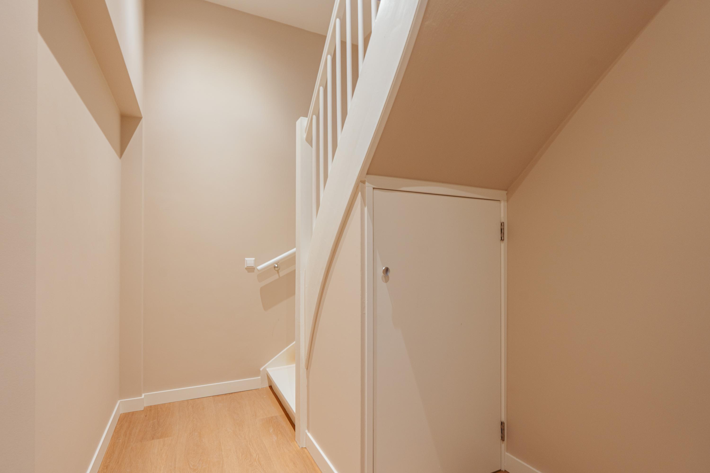 Het appartement is bereikbaar via een gemeenschappelijke entree, met een eigen opgang op de eerste verdieping met ruime trapkast. De woning strekt zich uit over de tweede en derde — tevens bovenste — verdieping van het pand.