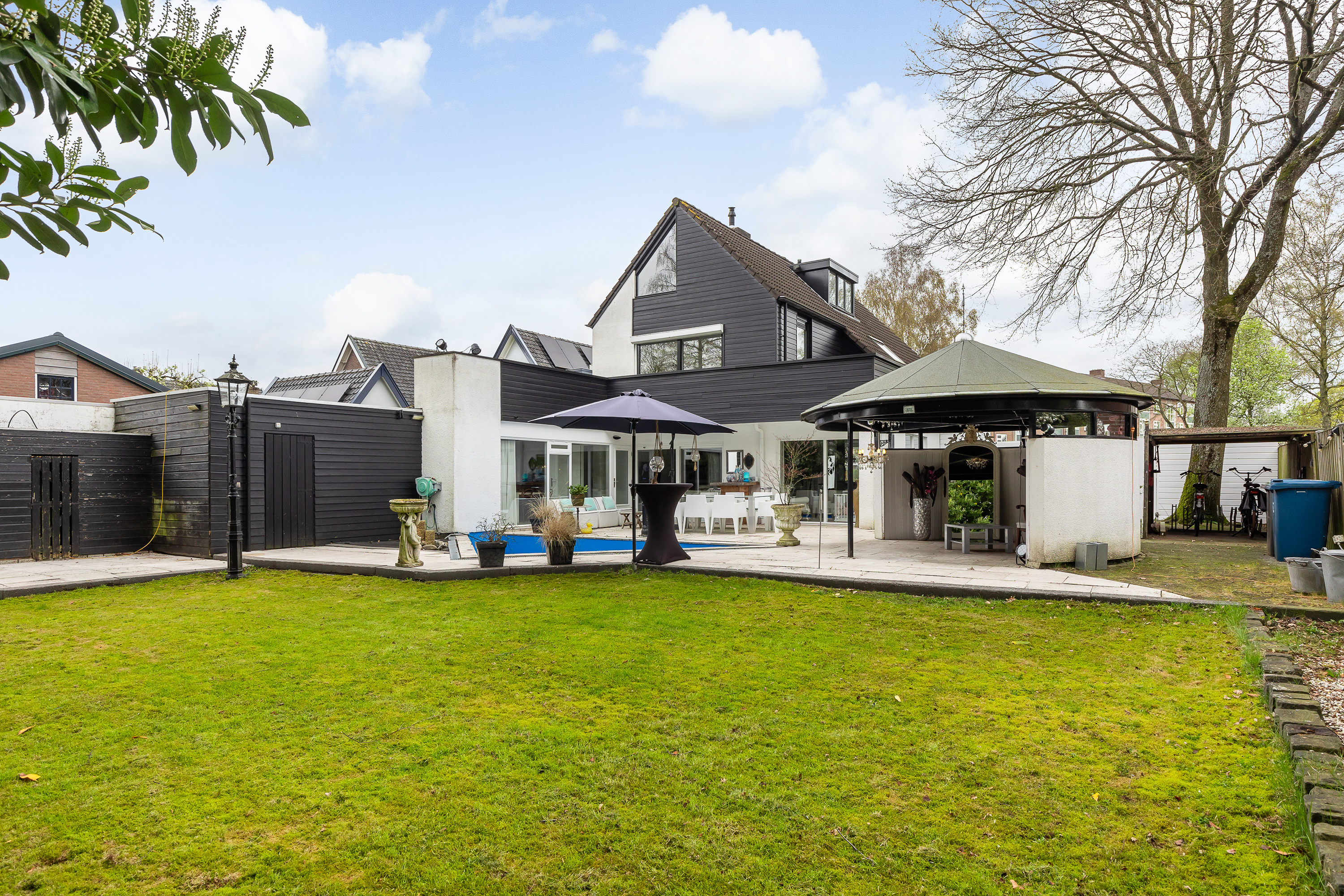With a living area of no less than 230 m², this property offers exceptional space for both living and working. The house was designed and built in 1987 by an architect as his own home, which is evident in the quality of the construction and the thoughtful layout. The entrance hall with double doors leads to a spacious T-shaped living room and a spacious kitchen-diner, both with underfloor heating. The garden room, insulated former garage, six bedrooms and two bathrooms make the house multifunctional. The many windows provide plenty of light and contribute to the pleasant living environment.