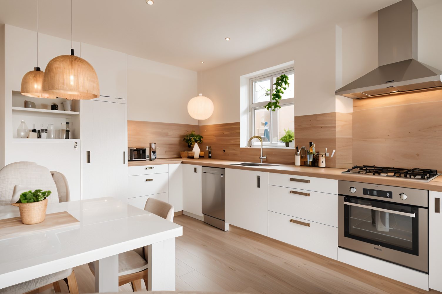 At the front of the house is the spacious kitchen/diner with a charming triangular bay window. The cream white kitchen with stainless steel accents is fitted with integrated appliances: 5 burner gas hob, extractor hood, combi oven, dishwasher and fridge. There is space for a large dining table with 10 chairs and a sideboard, making this a great place to cook and socialise.