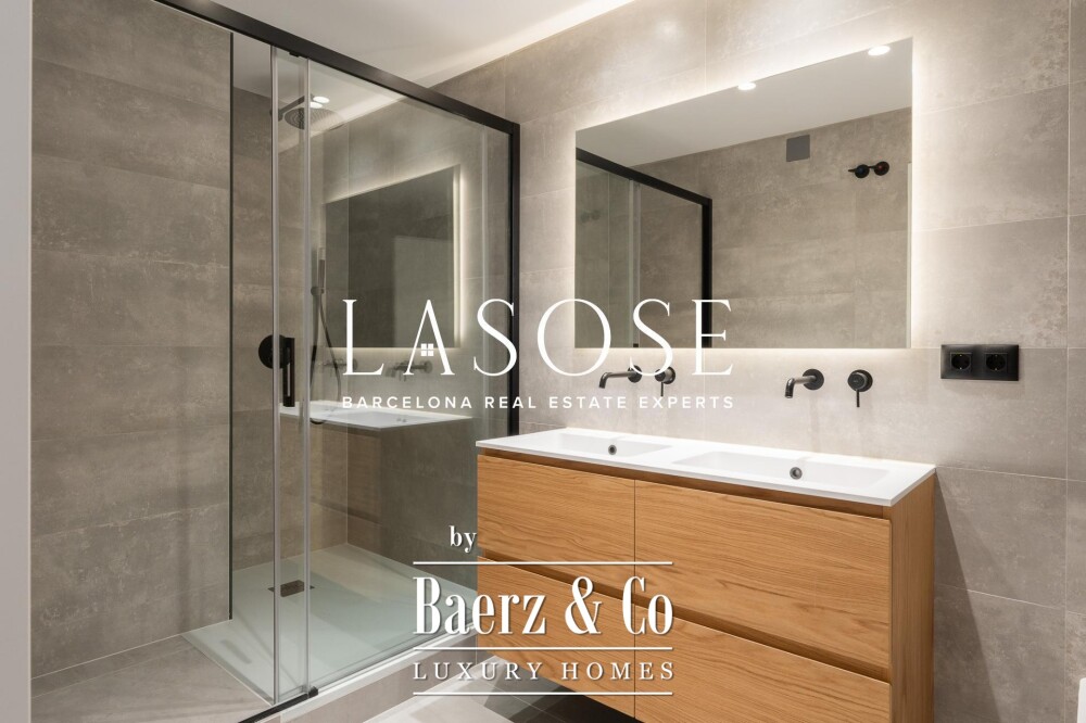Three bedrooms, including a master suite with private bathroom and separate dressing room, are complemented by fitted wardrobes and custom carpentry. Comfort is assured through aerothermal air conditioning and double-glazed wooden windows. Residents benefit from the convenience of an elevator, concierge service, video intercom, and secure armored door. The long-tail variation luxury apartment for sale in Barcelona is well-suited for those who value discretion and design.