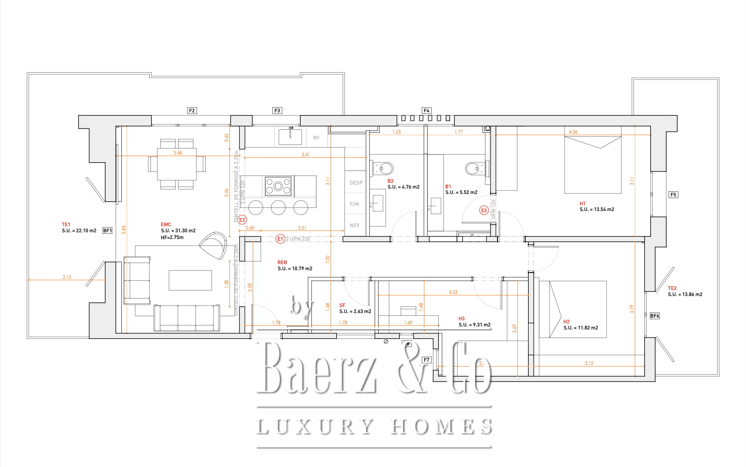 In the living area, we find a spacious living-dining room with access to the 30 m2 terrace, a perfect private oasis for relaxing or entertaining guests; a fully equipped kitchen with an island and a separate utility area.