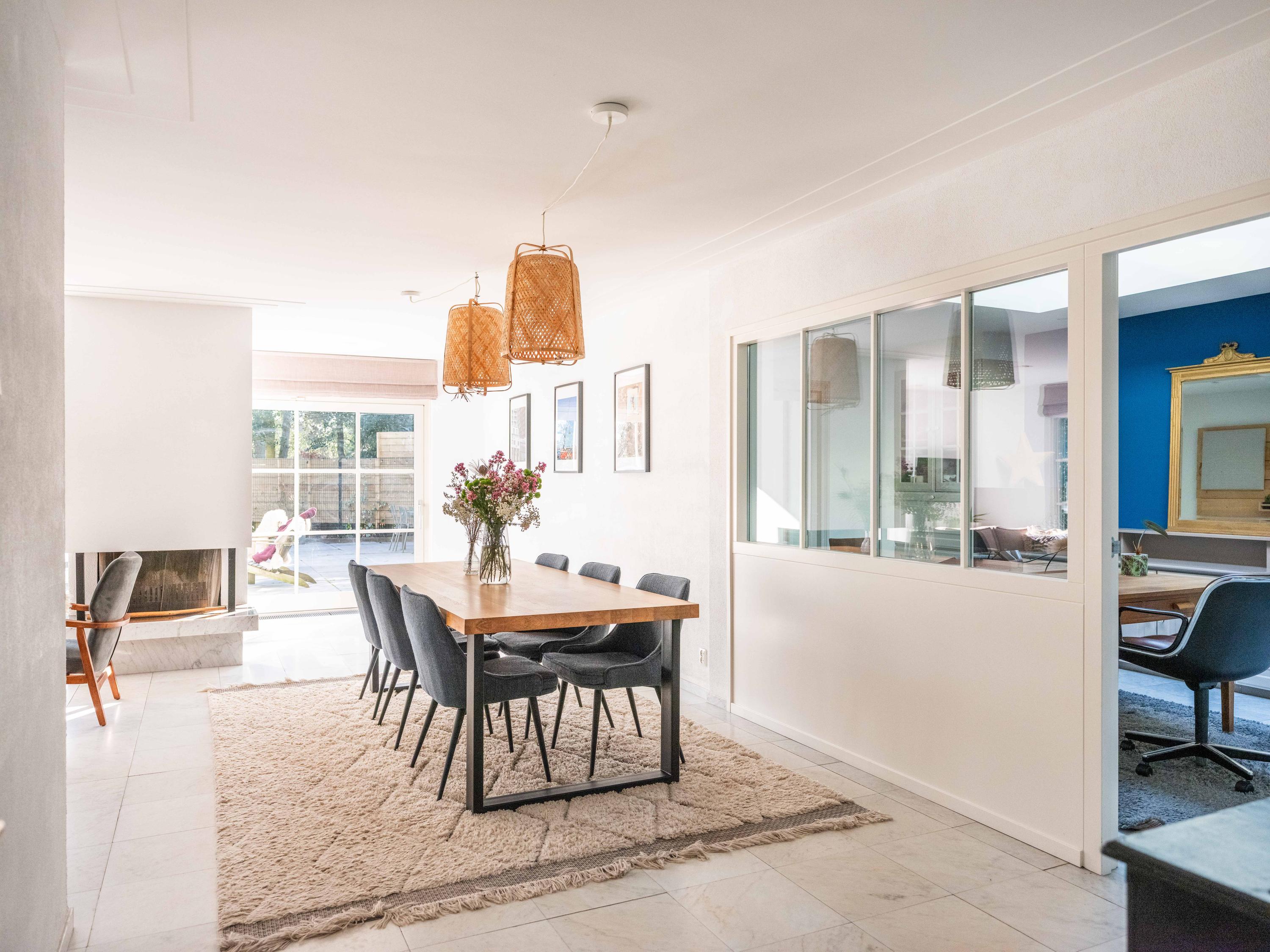 From the hall we enter the spacious kitchen, which is equipped with all kinds of appliances, such as a five-burner induction hob, quooker, steamer, two combi ovens etc. The cooking enthusiast can have a great time here.