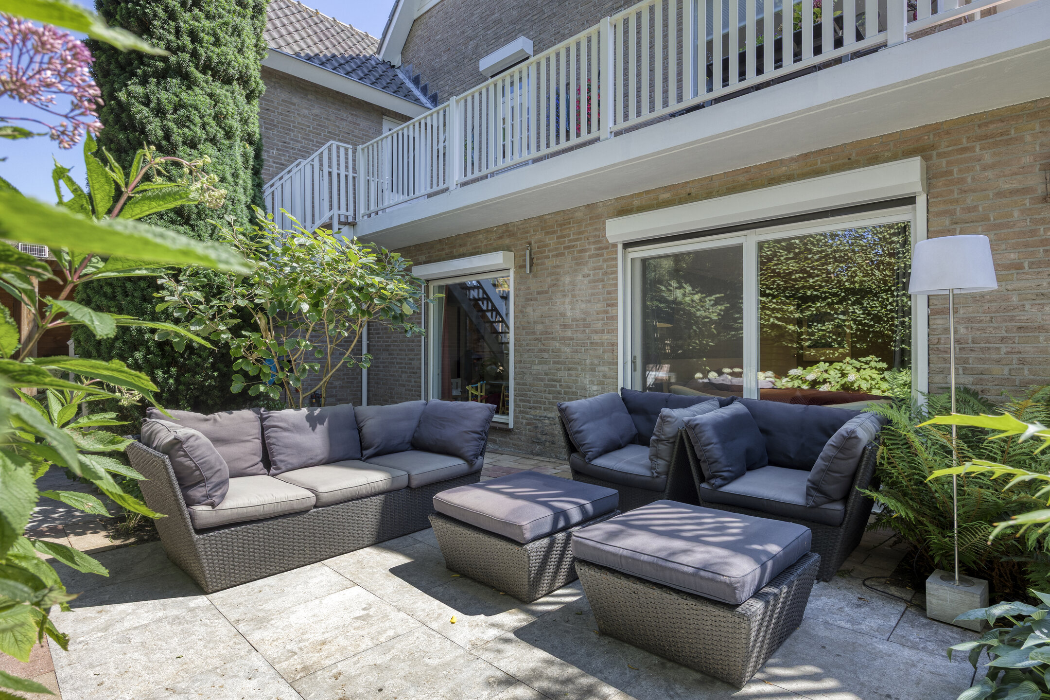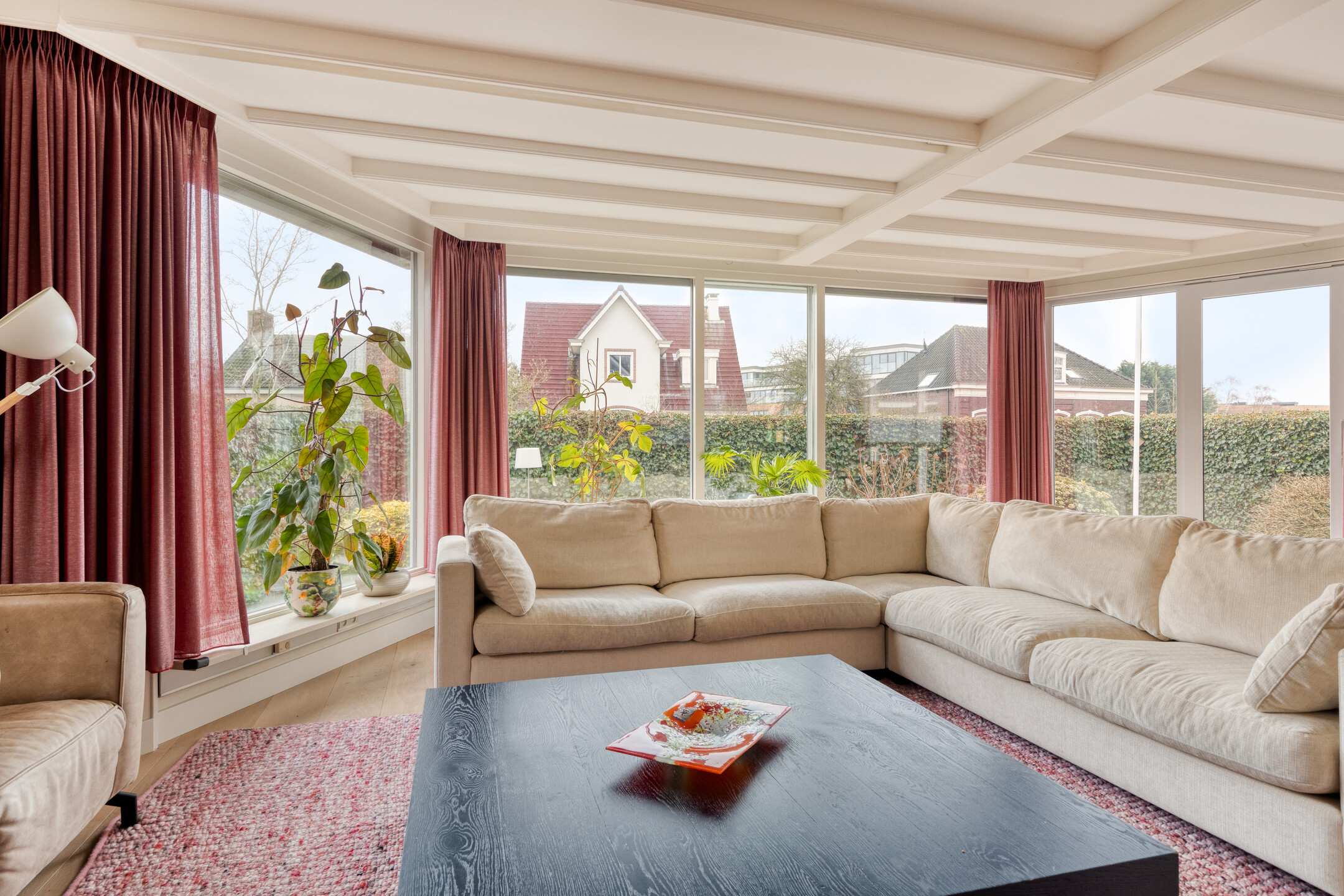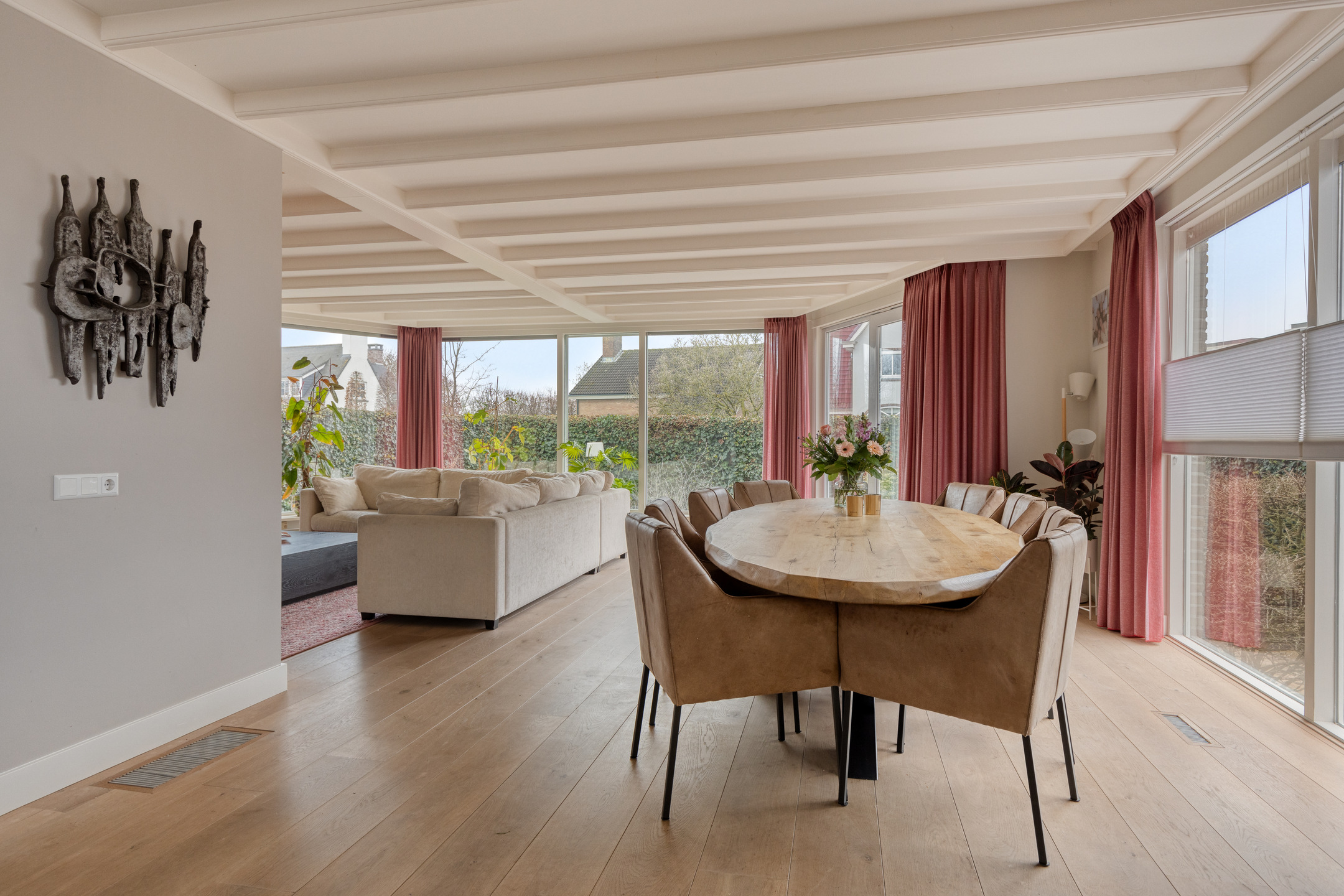 A large driveway with electric charging point introduces the property, complemented by a private garage. Expanses of glass and a serene conservatory suffuse the main living area with light, where a wooden floor and open fireplace create a welcoming atmosphere. The kitchen, with its modern island and extensive built in appliances, includes features such as a climate cabinet, Quooker and steam oven. Adjacent balconies and gardens offer seamless transitions between indoor and outdoor life, with sun throughout the day and practical roll down shutters, sun awnings and twenty solar panels ensuring both comfort and efficiency.