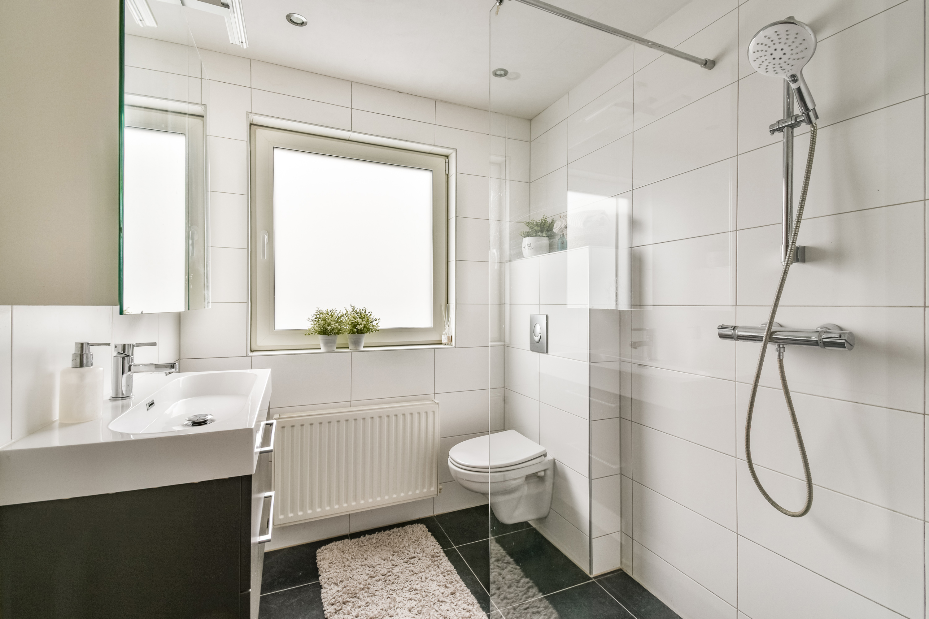 The bathroom is equipped with a shower, washbasin, toilet, and underfloor heating.