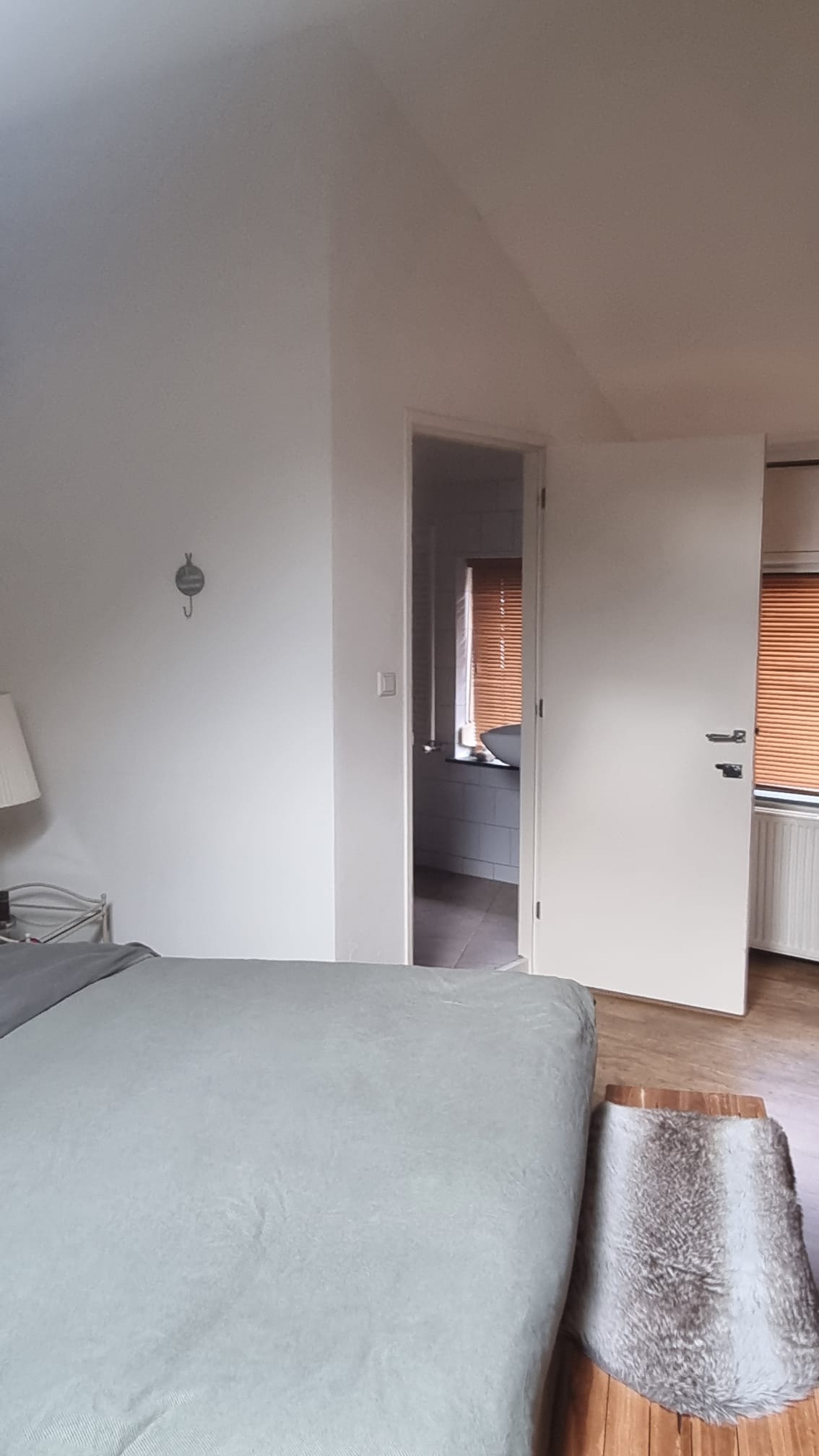 On the ground floor, the entrance opens into a spacious living room with air conditioning and a fireplace, complemented by wide doors leading directly to the garden and sunny patio. Adjacent to the kitchen equipped with built-in appliances lies a utility room and indoor storage. The massief oak flooring throughout the main level introduces warmth, while an extra versatile room opens onto the garden, providing possibilities for home office or creative pursuits.