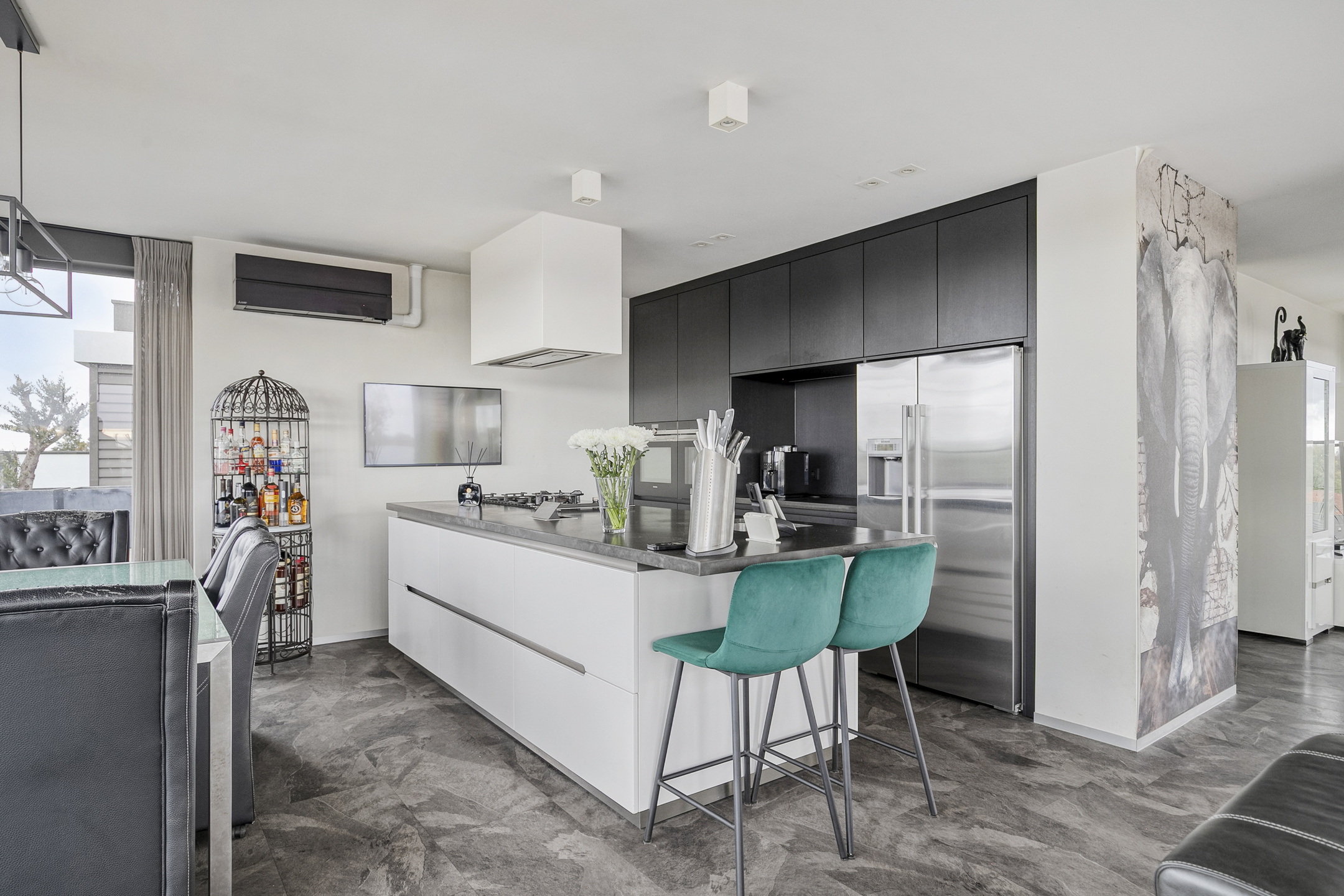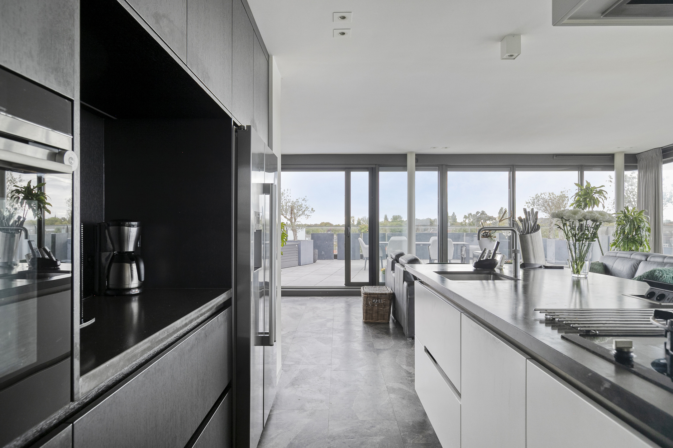 The modern open-plan kitchen with cooking island is equipped with various high-end built-in appliances, including a Quooker, gas stove, extractor hood, combination microwave, convection oven with steam function, fridge-freezer combination, and dishwasher.