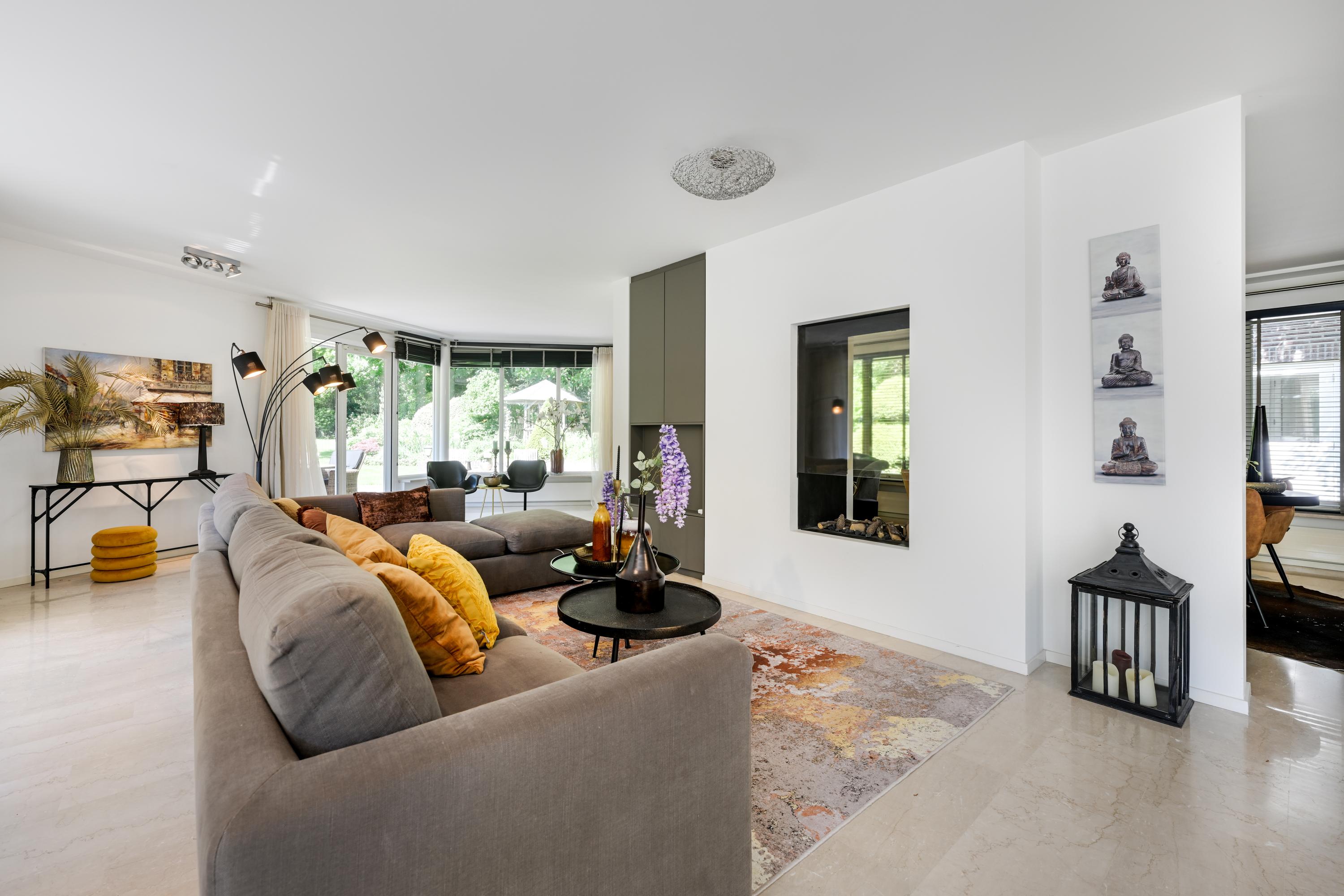 Spacious hall with staircase and lift, modern toilet and cloakroom, double doors to bright, spacious living room with round bay window, cosy living room with (gas) fireplace and garden-facing bay window with French doors to the terrace (southwest), from the hall and living room access to the spacious, bright kitchen with multiple built-in appliances, utility room with connections for washing and drying appliances, door to the garden. Next to the hall is a study/workroom with custom-made curved cupboards and a bay window at the front.