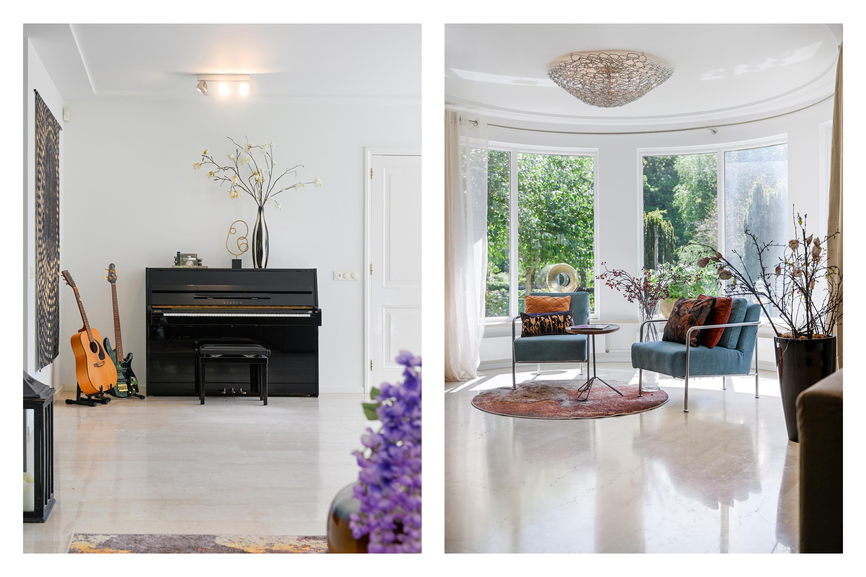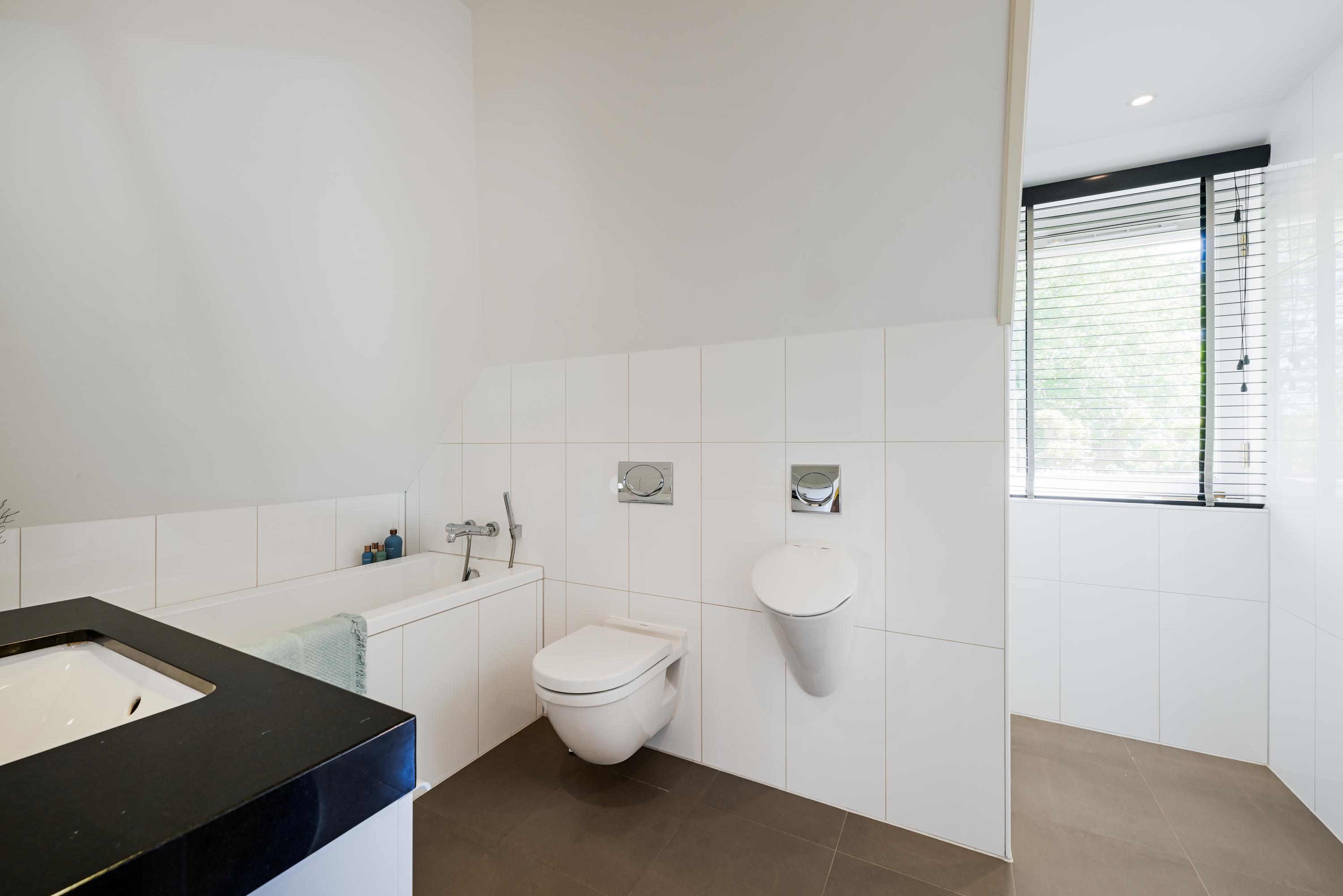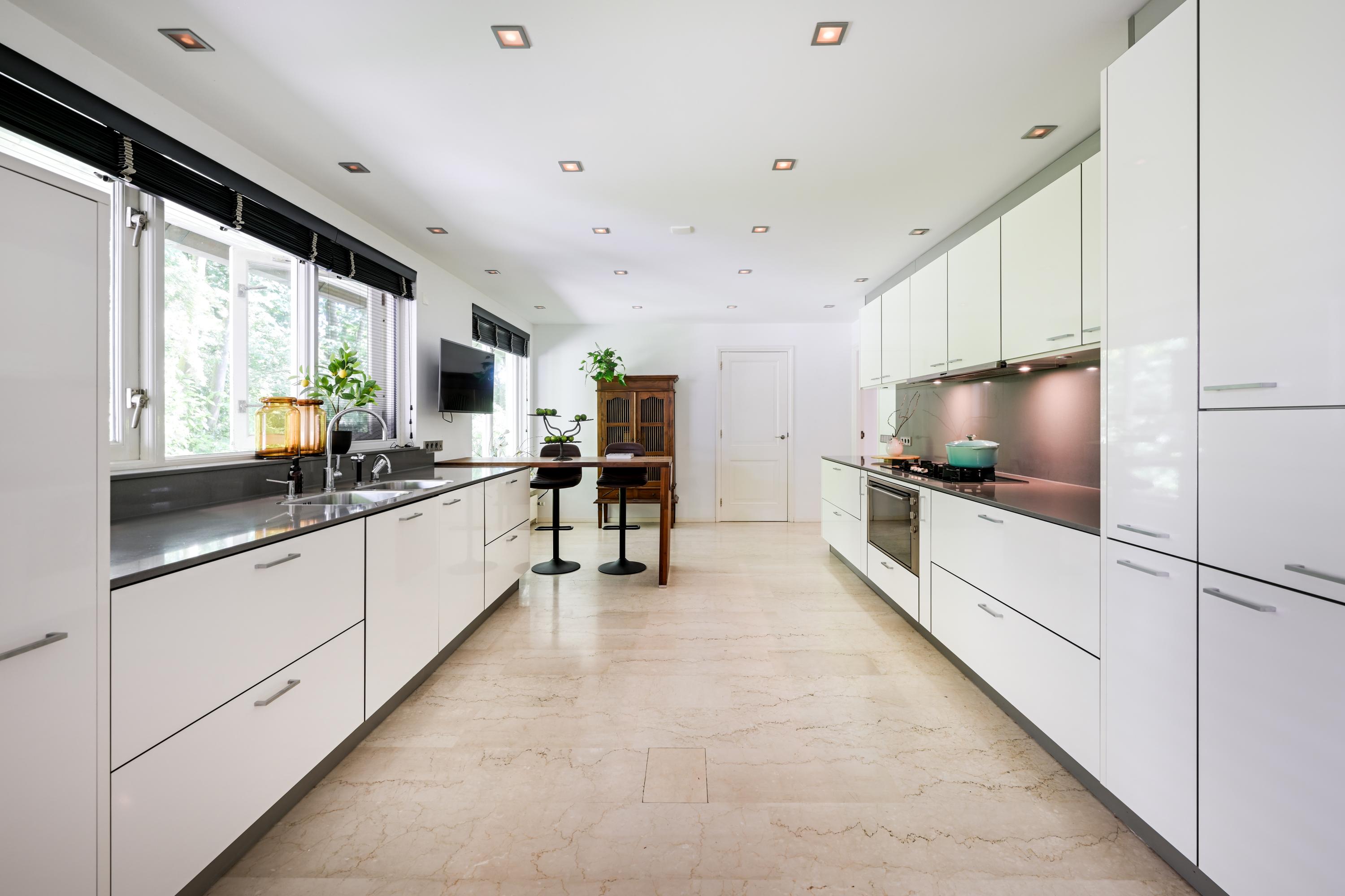 The villa, designed by architect Hans van Egmond, was constructed using high-quality materials and features a large living room and spacious kitchen, four bedrooms, two bathrooms, two or three studies/bedrooms, and a large attic floor. The house features a built-in lift to all levels, making it suitable for all stages of life.