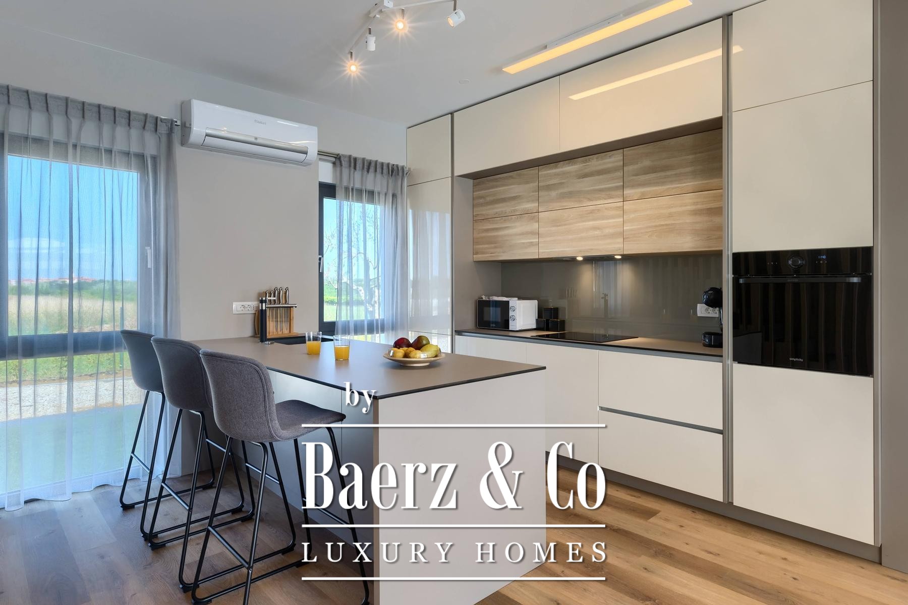 Townhouse Brtonigla is set in the heart of this picturesque Istrian town, surrounded by expansive greenery and mature olive groves. The property offers 274 m² of living space across two levels. The entry leads to an open-plan living room, a modern kitchen and dining area, and a bedroom suite with direct pool access. Practical features include a storage room, technical facilities, and a guest toilet with laundry.