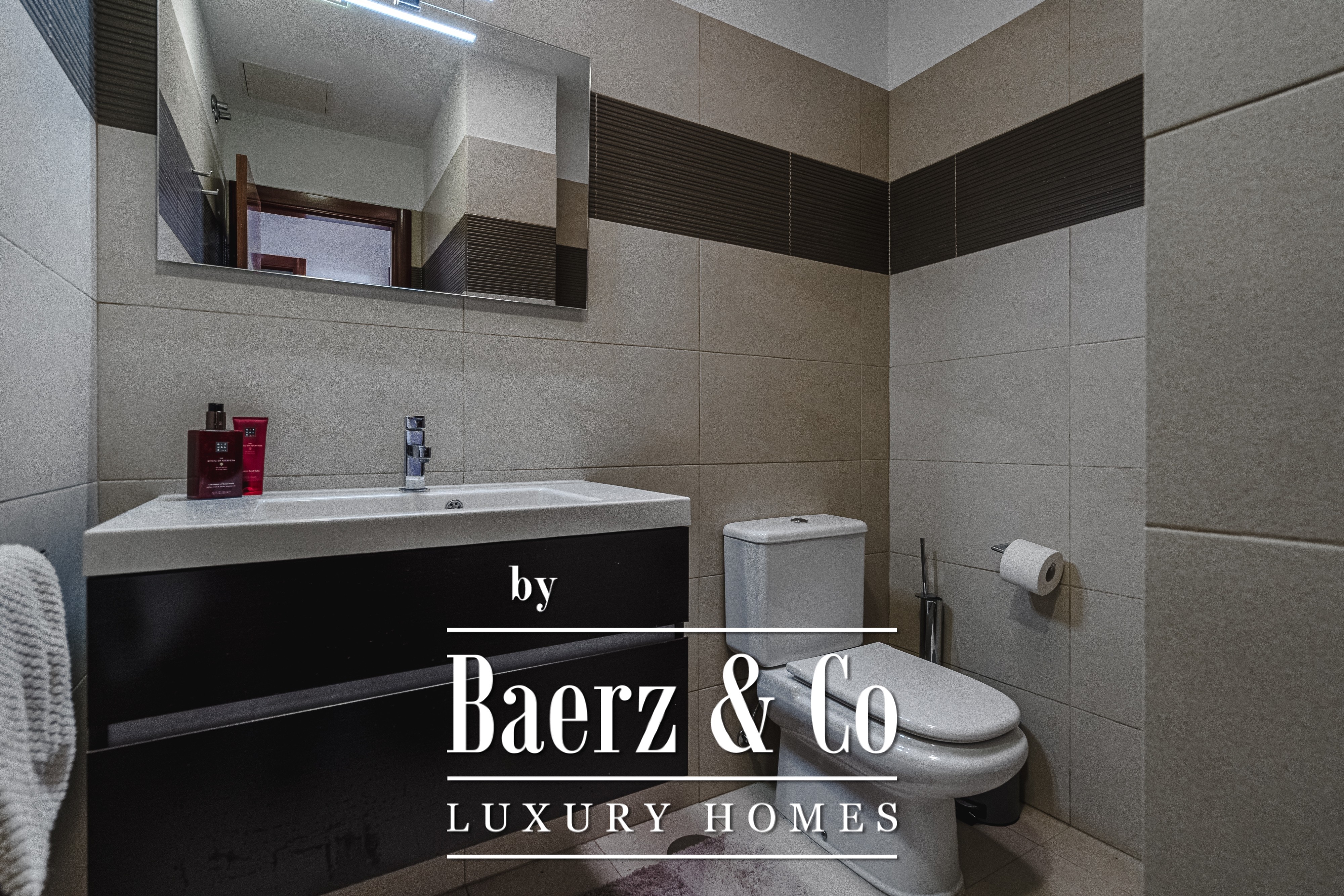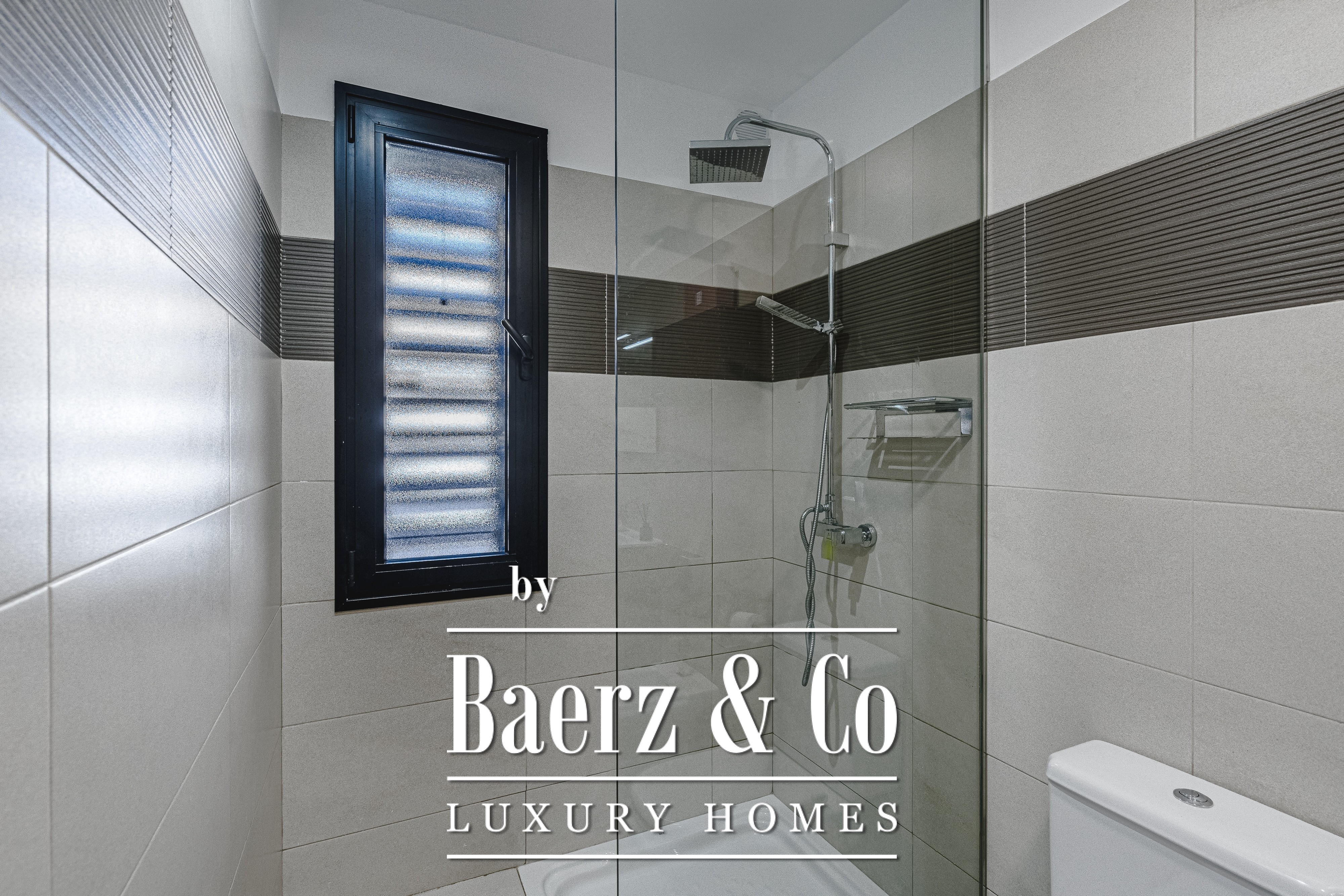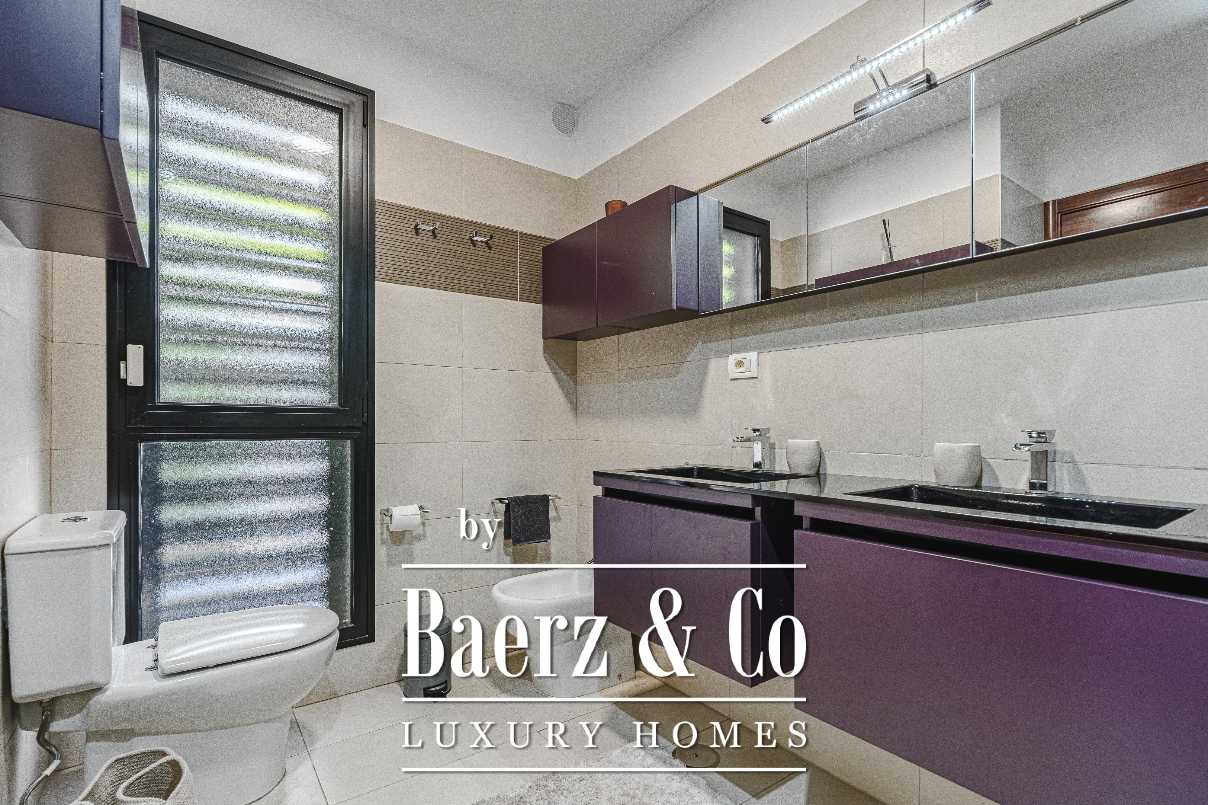 Inside, three bedrooms and three bathrooms are complemented by two kitchens, two laundry rooms, and a dedicated storage room. An independent guest apartment, complete with living room, bedroom, bathroom, walk-in closet, and kitchen, offers versatility and privacy for guests or extended stays. The residence is equipped with Daikin air conditioning, heat recovery ventilation, and a solar-powered water heating system for sustainable living.