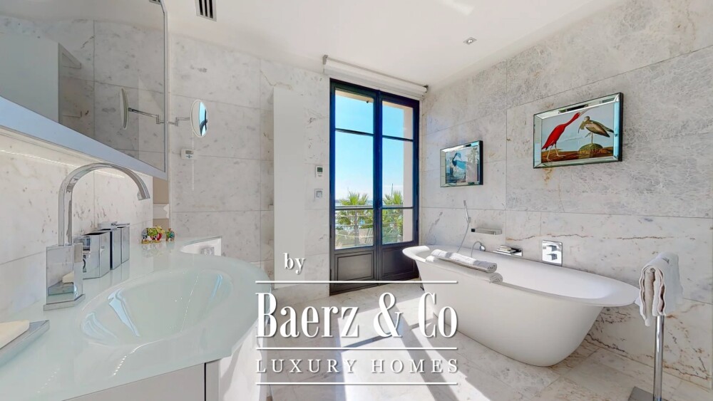 The lower floor redefines the art of leisure. A private cinema, wine cellar, and games room anchor the home’s atmosphere of relaxed refinement. Wellness spaces include fitness, sauna, hammam, and a jacuzzi, all complemented by an office, laundry, and a caretaker apartment. Four-car garage, advanced security, air-conditioning, and integrated technology ensure discretion and ease. The swimming pool and outdoor facilities celebrate Mediterranean living, all set within a carefully composed 719 m² plot. This luxury villa for sale in Cannes connects sea, city, and cultivated privacy in every detail.