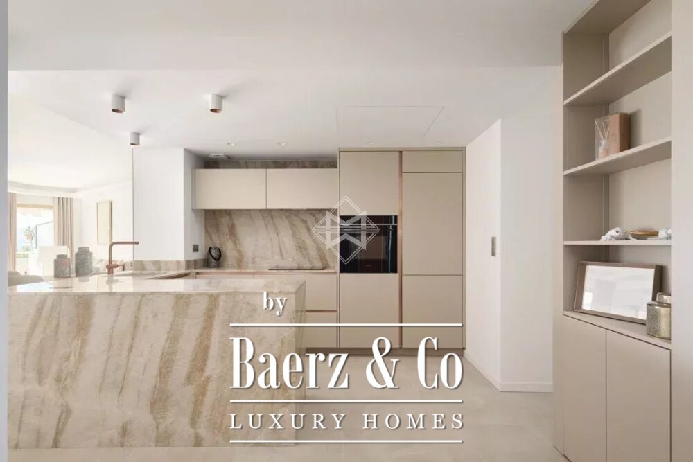 Three en-suite bedrooms, each with a private shower room, cultivate a sense of calm retreat and privacy. The kitchen is fully appointed, balancing form and function for effortless daily rhythm. Details such as double glazing, air-conditioning, and electric shutters ensure year-round comfort. The flow from indoors to terrace invites morning light and gentle sea breezes, while the collective parking and private cellar support a lifestyle of ease and discretion.
