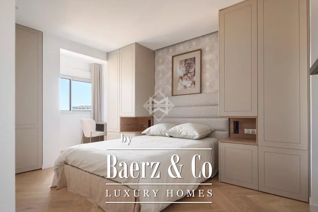 Apartment Cannes with sea views stands as a refined residence on the famed Boulevard de la Croisette, positioned directly opposite Port Canto. Spanning 95 m², this fully renovated space delivers a seamless interplay between elegant interiors and the cinematic sweep of the Mediterranean. The approach reveals a discreet entrance hall that sets a composed tone, leading into a spacious living room suffused with natural light. Glass doors draw the gaze outward and open to a terrace of approximately 12 m², offering an ever-present dialogue with the sea and distant hills.