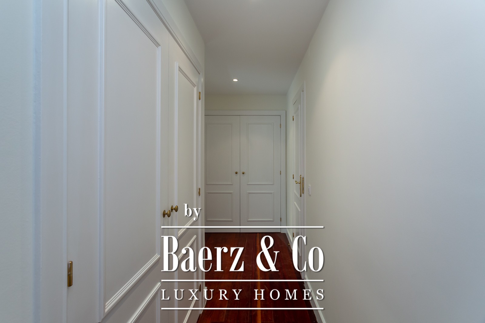 The kitchen serves as both functional space and family gathering point, supported by a pantry and a multi-purpose lounge in the semi-basement. Finishes in wood and marble express lasting quality and restraint. Radiator heating offers seasonal comfort, and secure parking for two cars is accessible via lift. Within the grounds, gardens and a pool invite calm, while shared amenities include a barbecue kiosk and visitor parking. This luxury duplex apartment for sale in Estoril offers discreet access to Lisbon, international schools, and the timeless rhythm of the Atlantic coast.