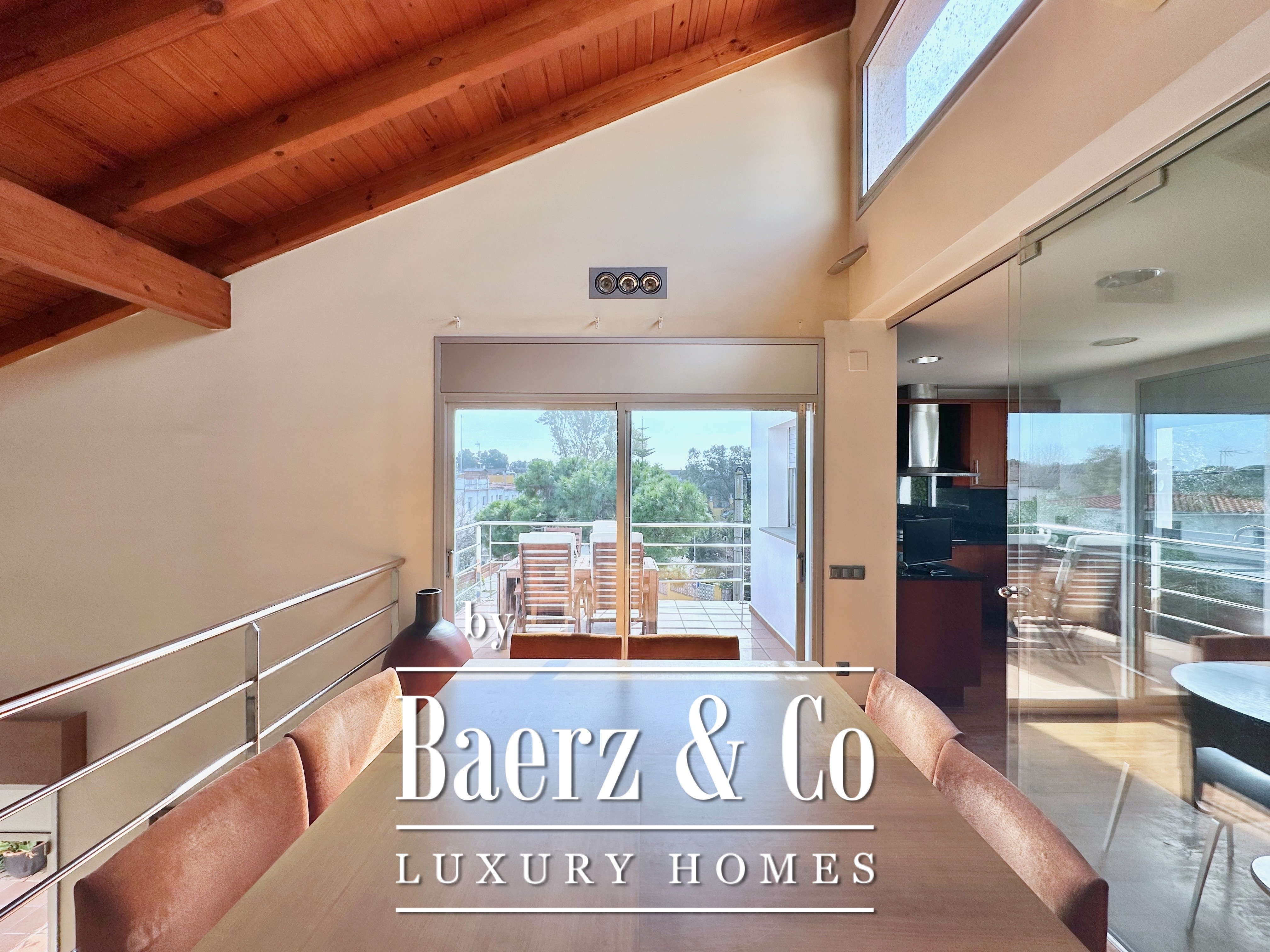 Natural light fills the main floor through generous windows, illuminating the open kitchen and dining area. A south-facing terrace seamlessly extends the indoor living space outdoors, framing the seasonal rhythms of Mediterranean life. The dining room features a striking sloped wooden ceiling with exposed beams, imparting warmth and a distinct architectural character. It connects visually and spatially to the expansive living room below, enhancing the home's sense of openness.