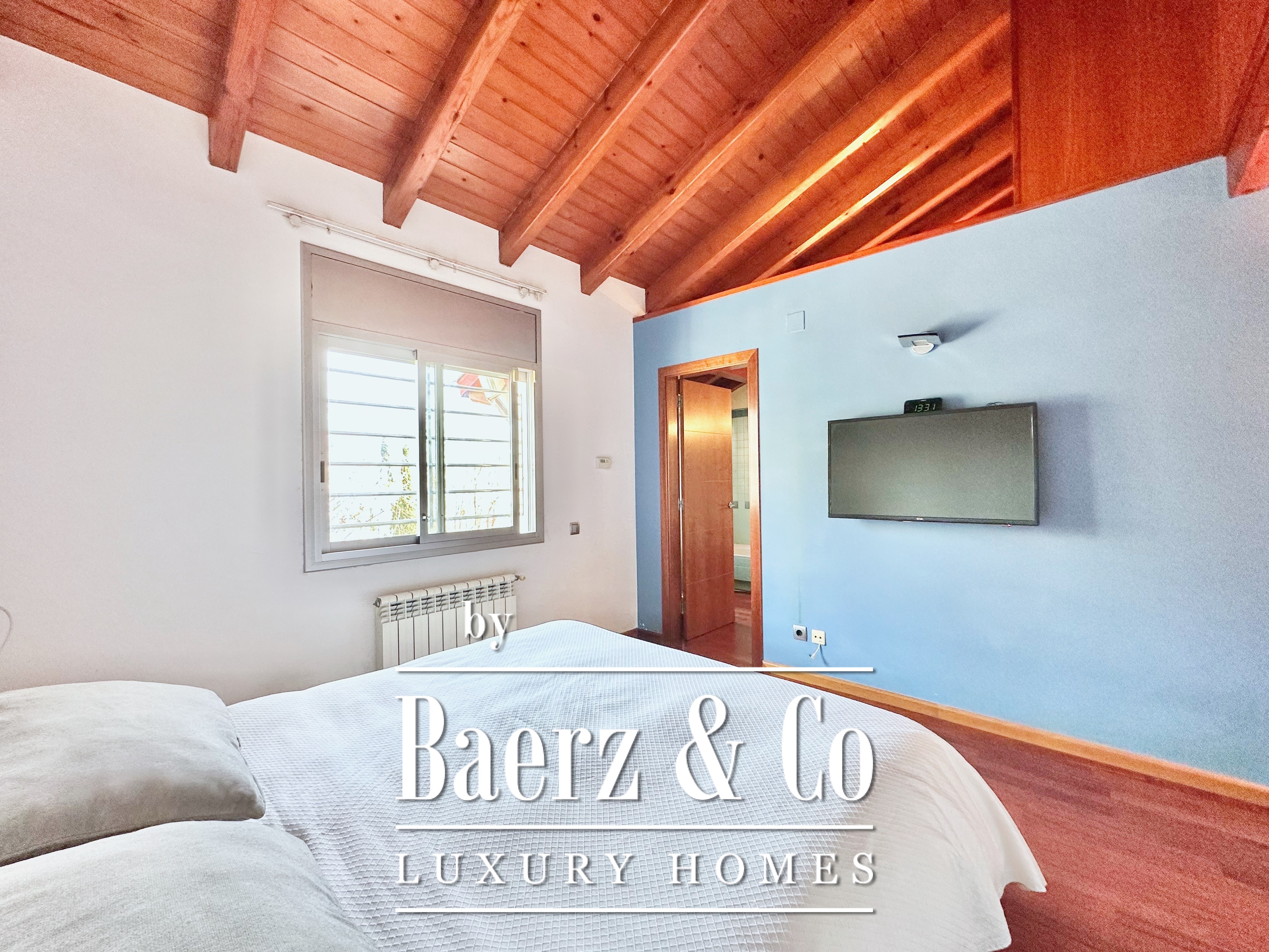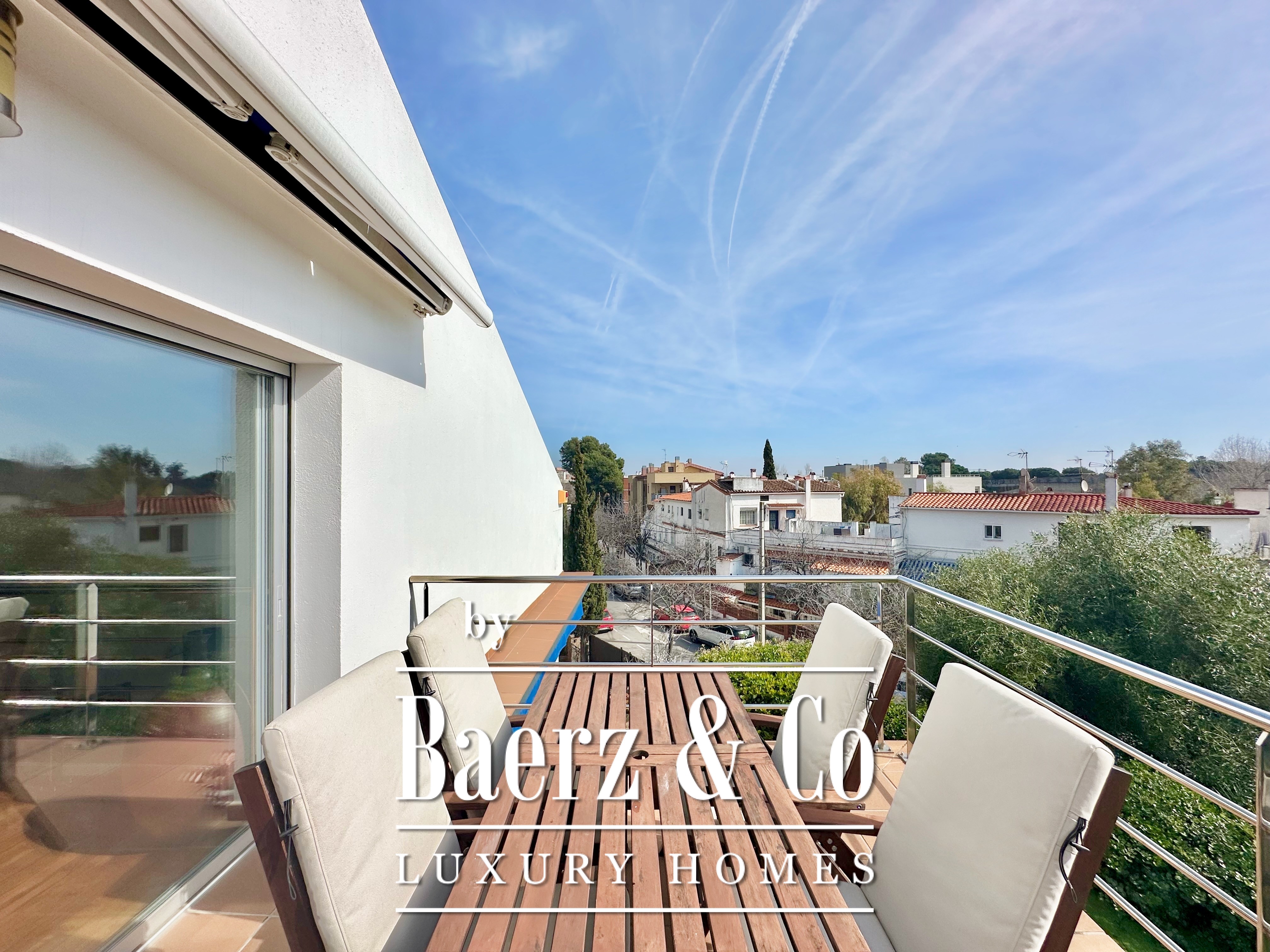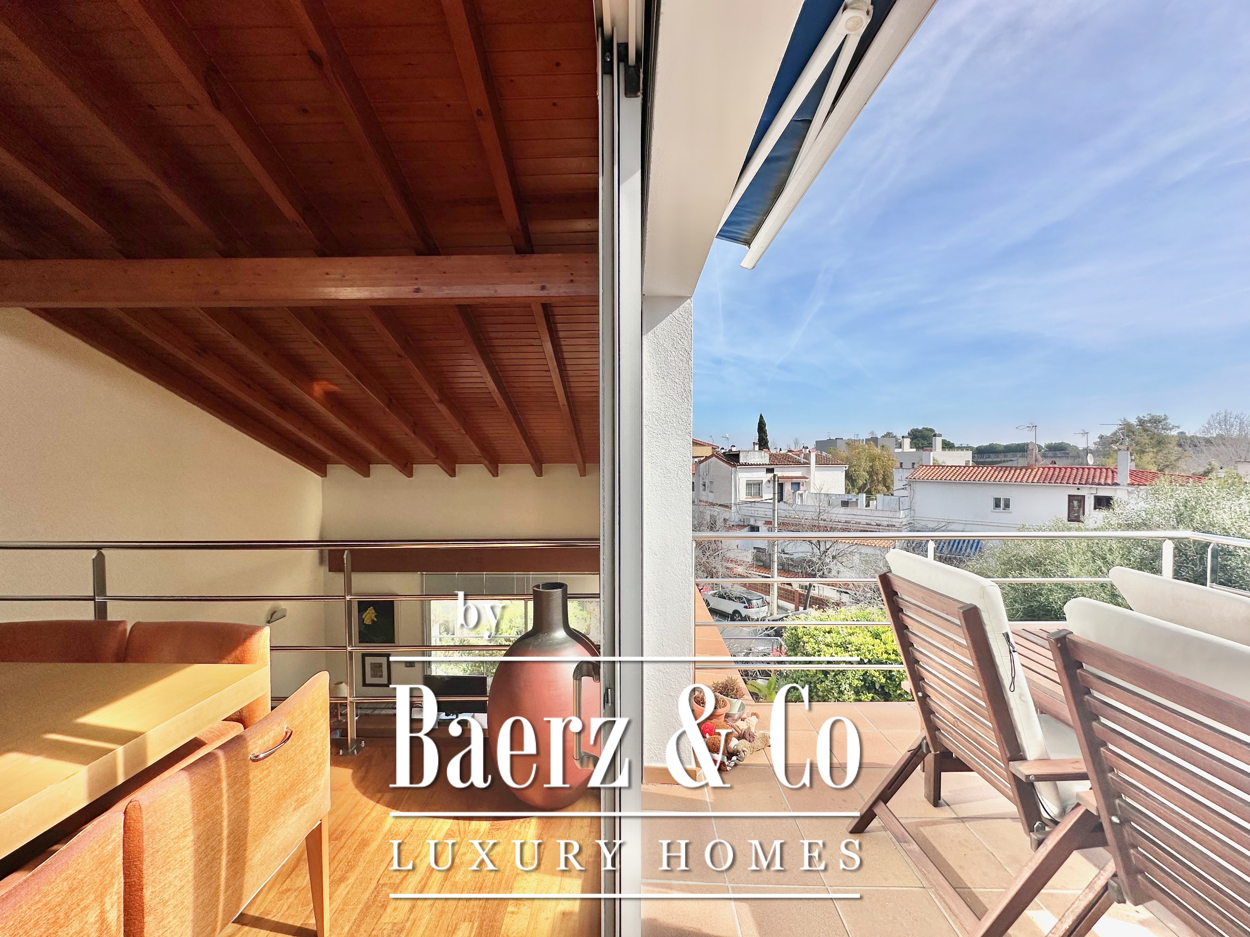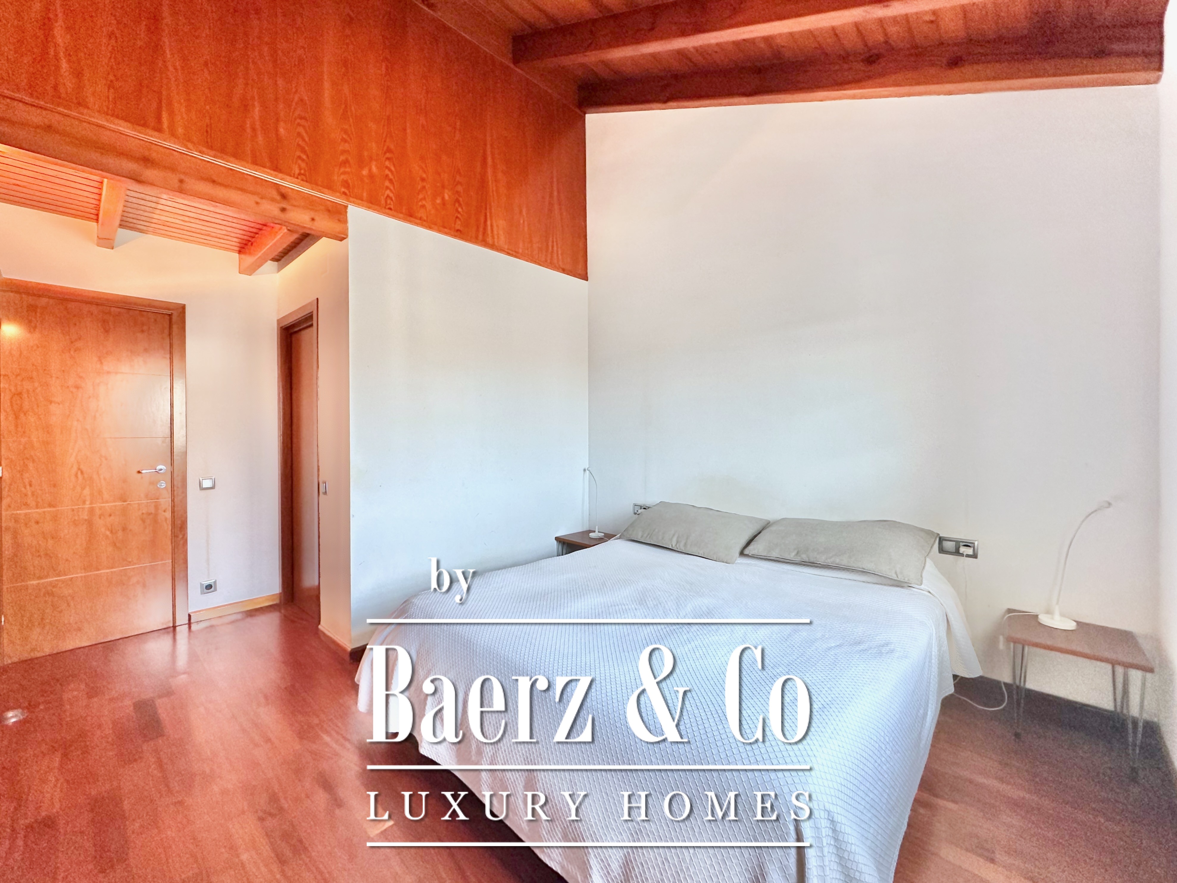 The private quarters include five bedrooms and two bathrooms. Two double rooms merge into a flexible, expansive suite above 20 m², easily returned to the original layout. An attic loft offers potential for work or leisure with direct access to a 20 m² terrace showcasing panoramic mountain views. The main suite features a dressing area and an elegant five-piece bathroom, balancing comfort with quiet sophistication. This detached house for sale in Castelldefels subtly integrates every element for a considered lifestyle in one of Spain’s respected coastal localities.