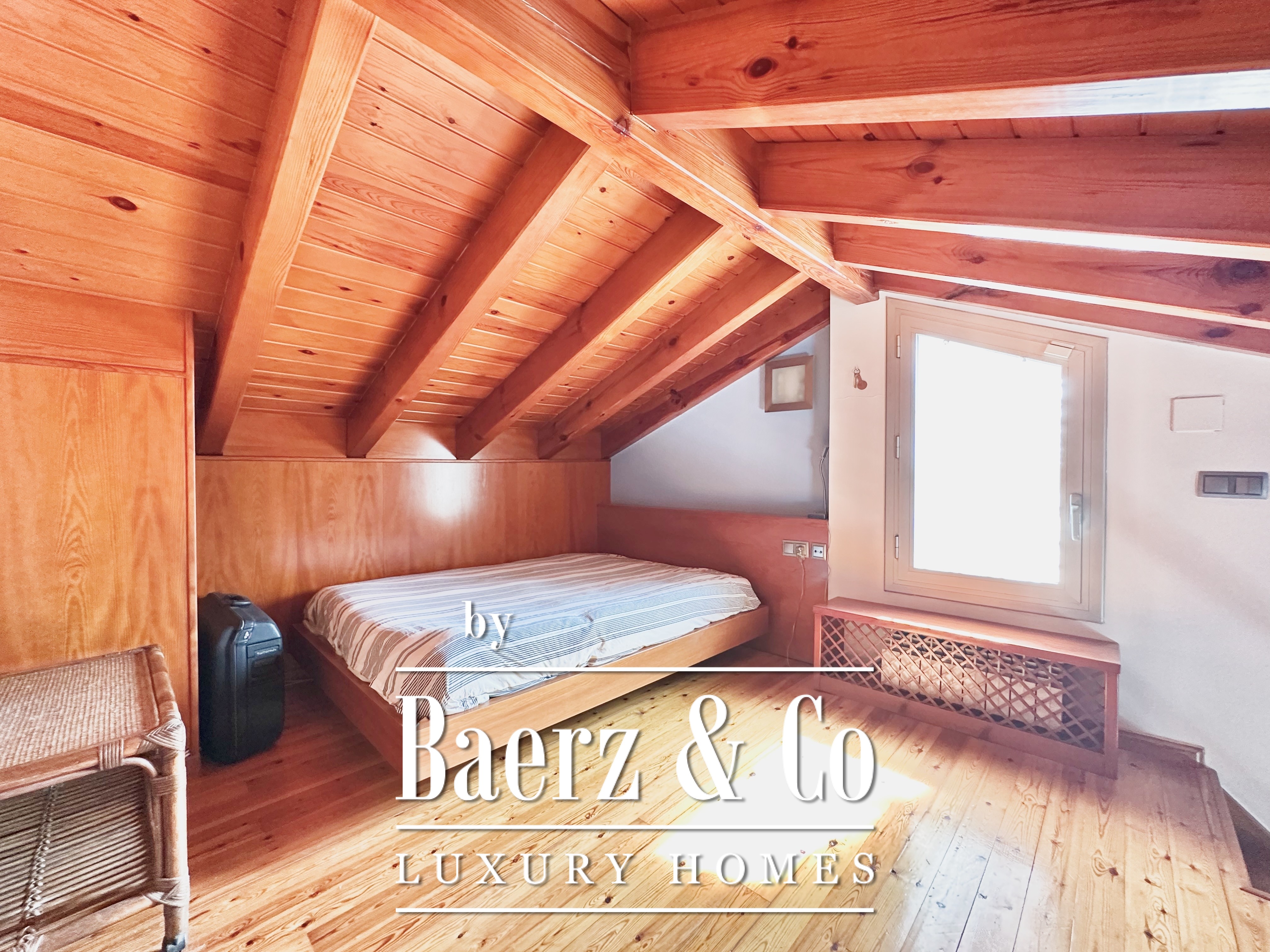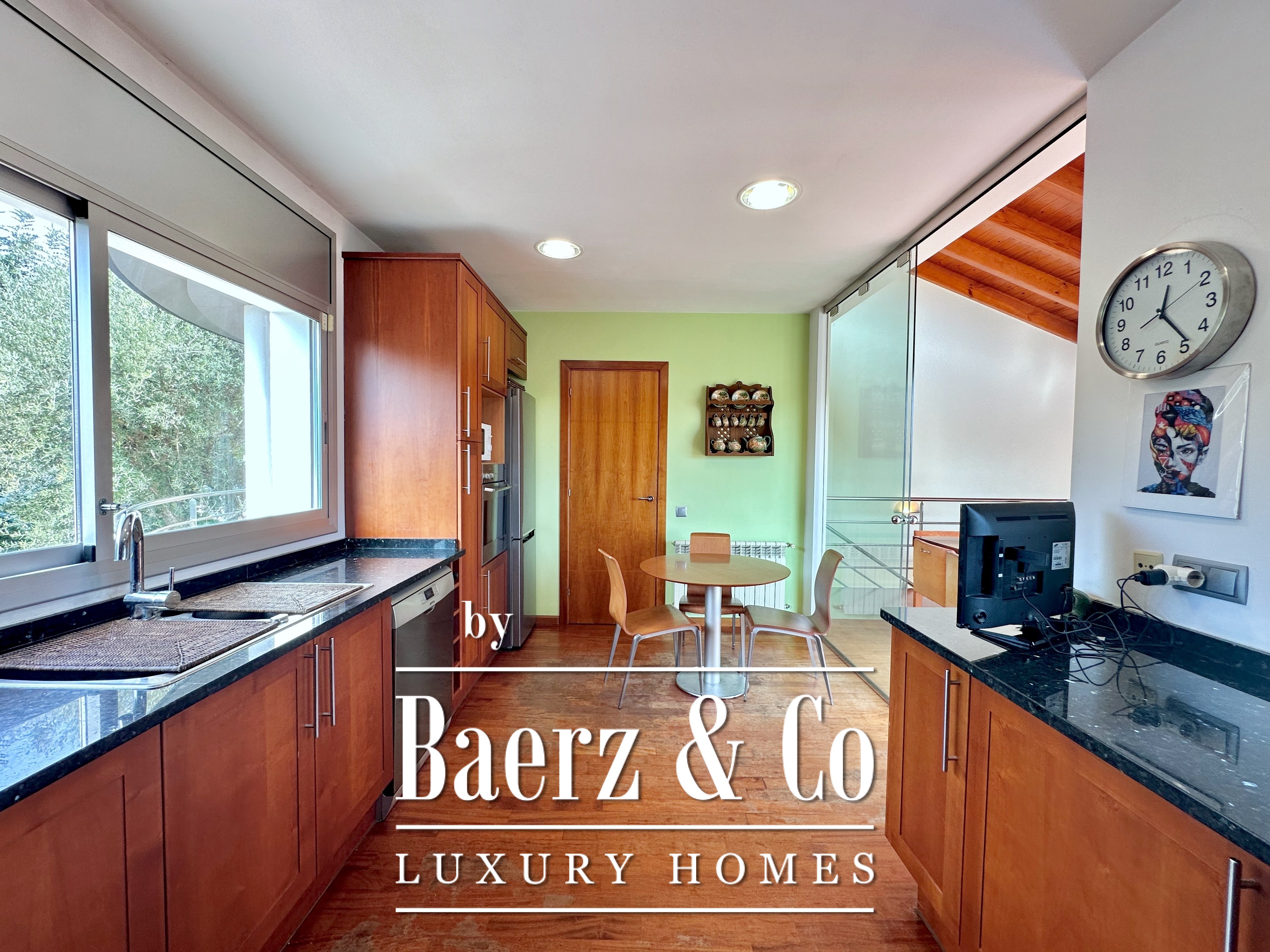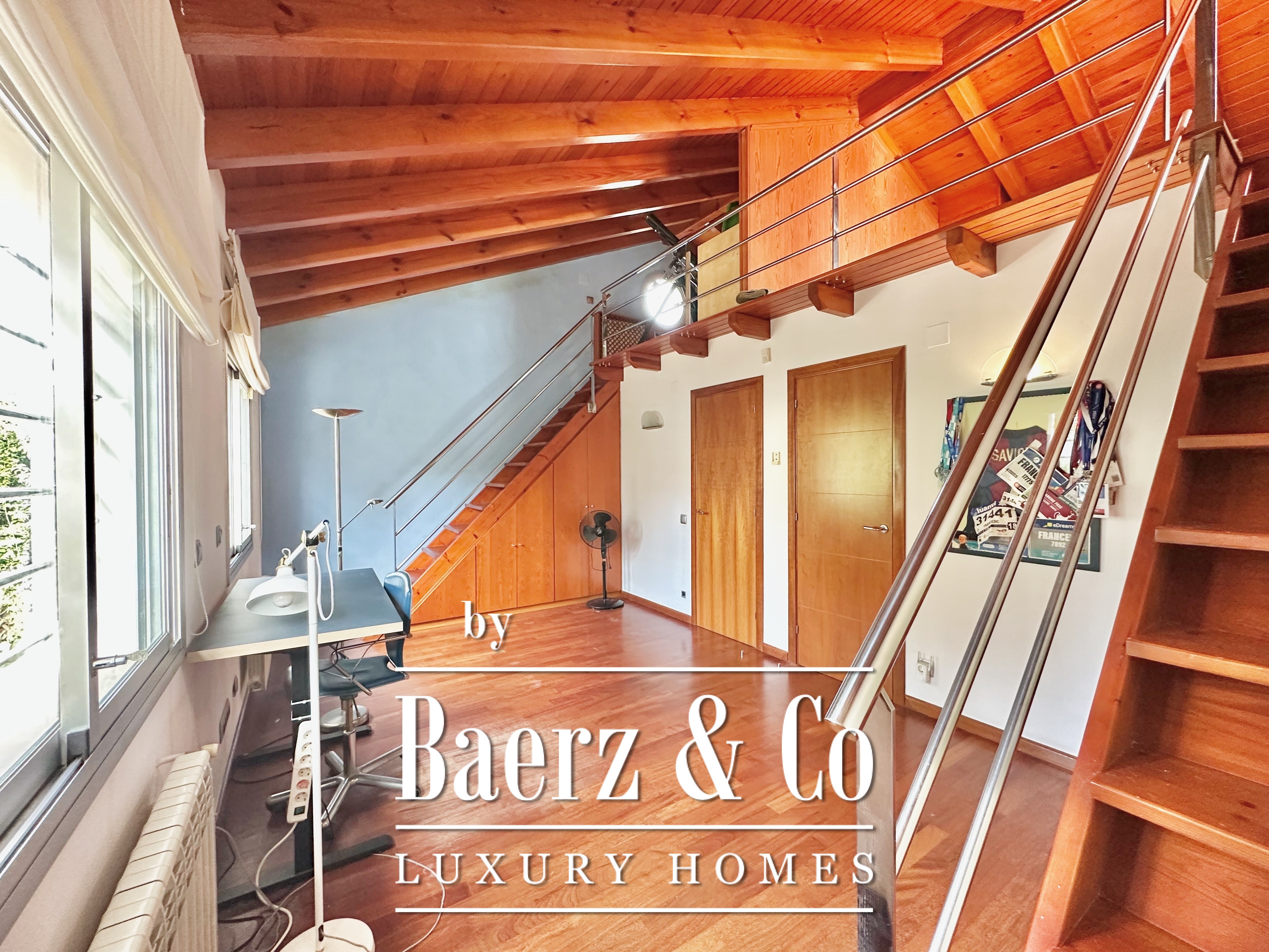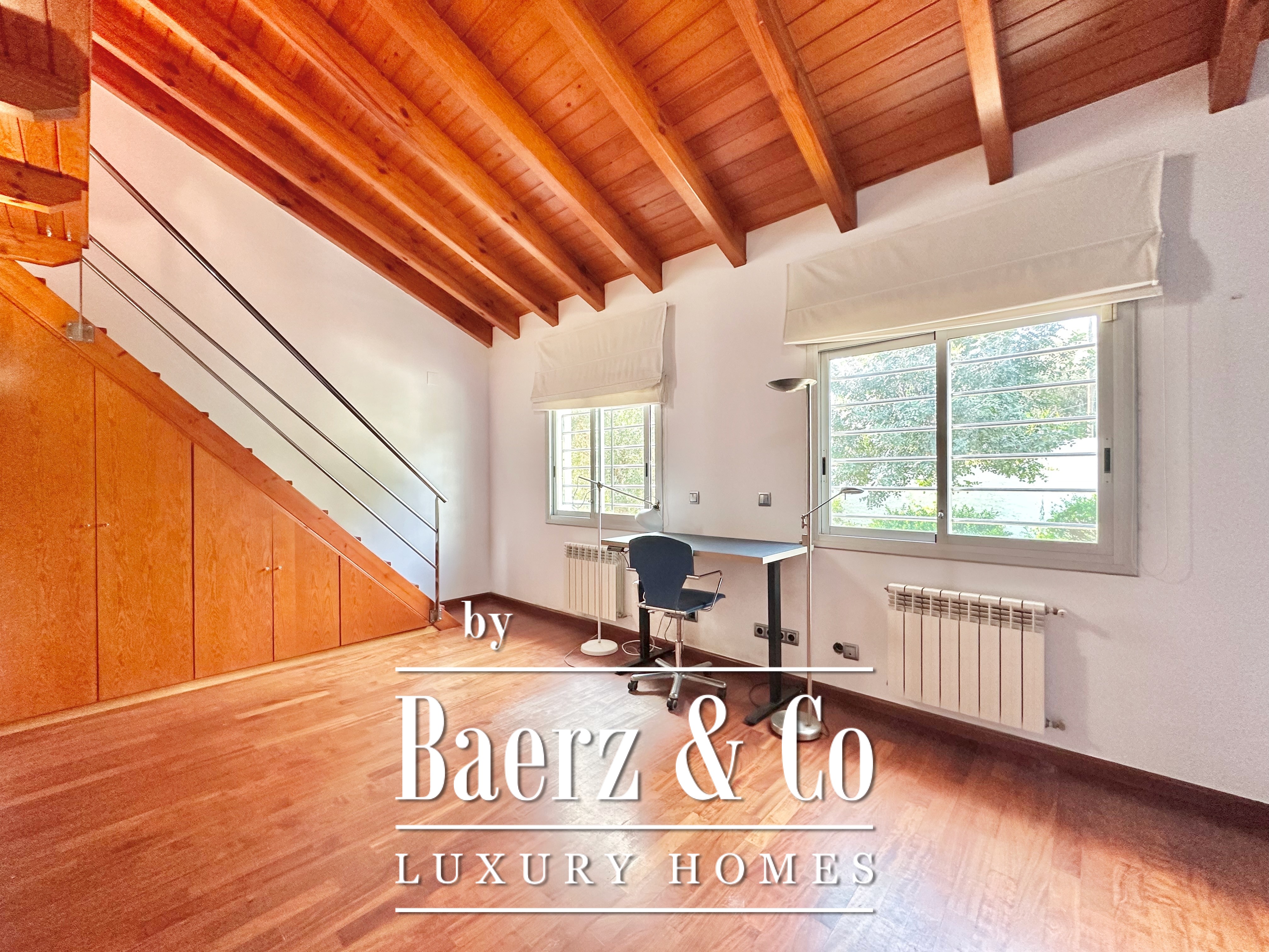 The private quarters include five bedrooms and two bathrooms. Two double rooms merge into a flexible, expansive suite above 20 m², easily returned to the original layout. An attic loft offers potential for work or leisure with direct access to a 20 m² terrace showcasing panoramic mountain views. The main suite features a dressing area and an elegant five-piece bathroom, balancing comfort with quiet sophistication. This detached house for sale in Castelldefels subtly integrates every element for a considered lifestyle in one of Spain’s respected coastal localities.