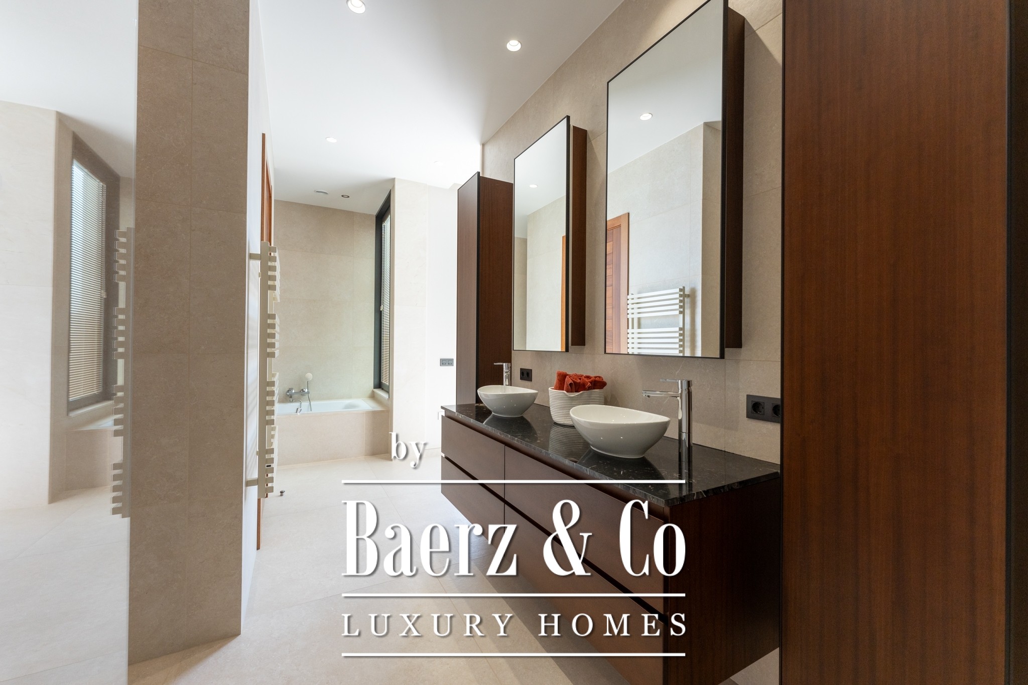 On the ground floor, you will find one of the bedrooms, a spacious living room with a bar for entertainment and a sleek designer kitchen, all finished to an impeccable standard. The villa has a total of 4 spacious en-suite bedrooms and a total of 6 beautiful bathrooms and a guest apartment with kitchen.