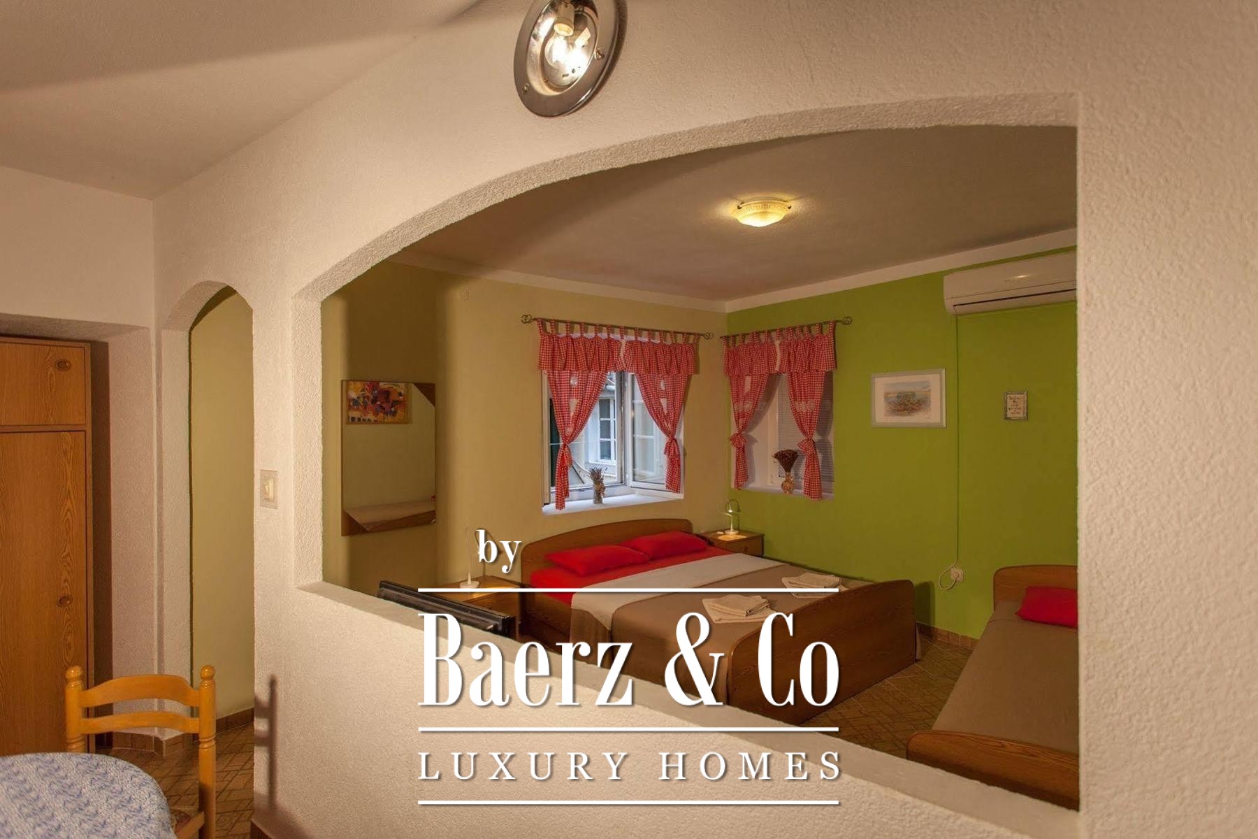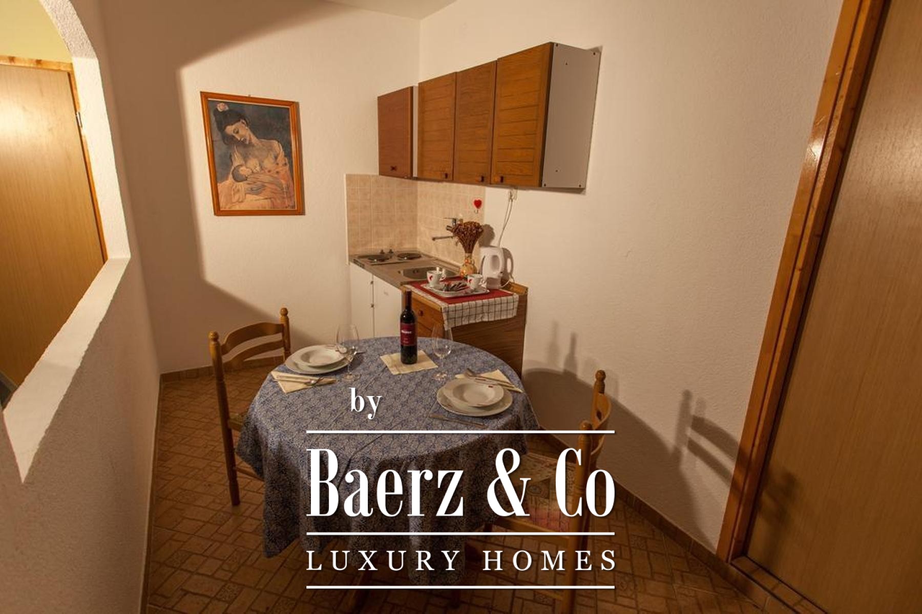The second level hosts two studio apartments and the entry level of an expansive duplex, featuring a kitchen, dining area, living zone, laundry, and a generous terrace. The upper duplex offers two bedrooms, a bathroom, and walk-in wardrobe, enhancing the sense of refined daily life. High-quality exterior carpentry, a renewed roof, and a recently restored façade reflect the investment in ease and integrity. Private parking for seven vehicles, positioned just 100 meters away, is included. This property’s versatility—family residence, guest house, or investment—makes it a rare offering amid the timeless allure of Cres.