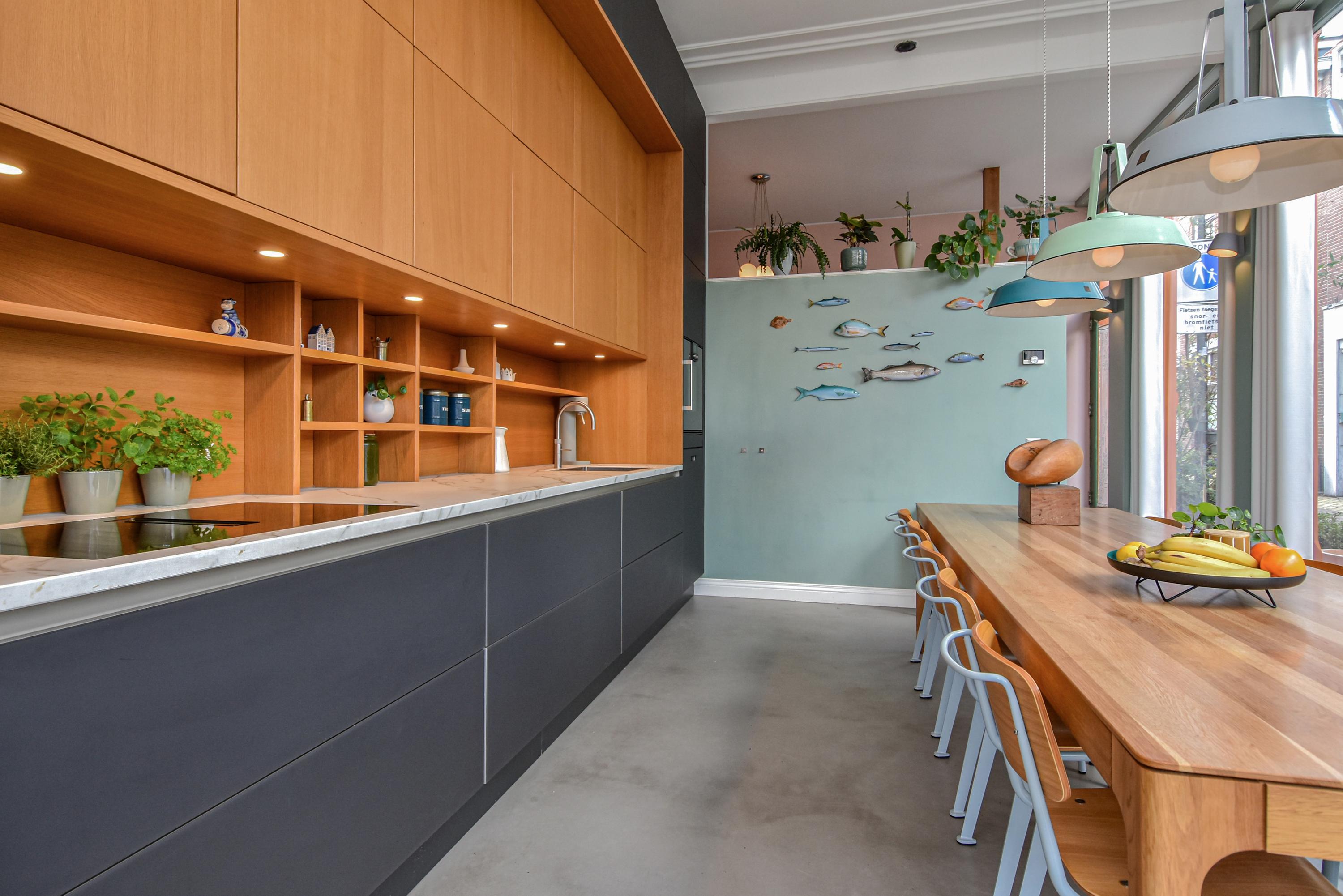 On either side of the kitchen are two inviting living areas: on one side a sitting room, and on the other a cozy living room with a comfortable seating area. Adjacent is an integrated studio, also featuring a high ceiling and French doors opening to the street. This room is arranged as a bedroom with its own bathroom, including a walk-in shower, double washbasin, and toilet—ideal as a guest suite, annex apartment, office, or practice space at home. At the rear, there is a large, practical bicycle storage room with attic space, accessible via Broerhuisstraat. From the living room, a straight staircase leads to the first floor.