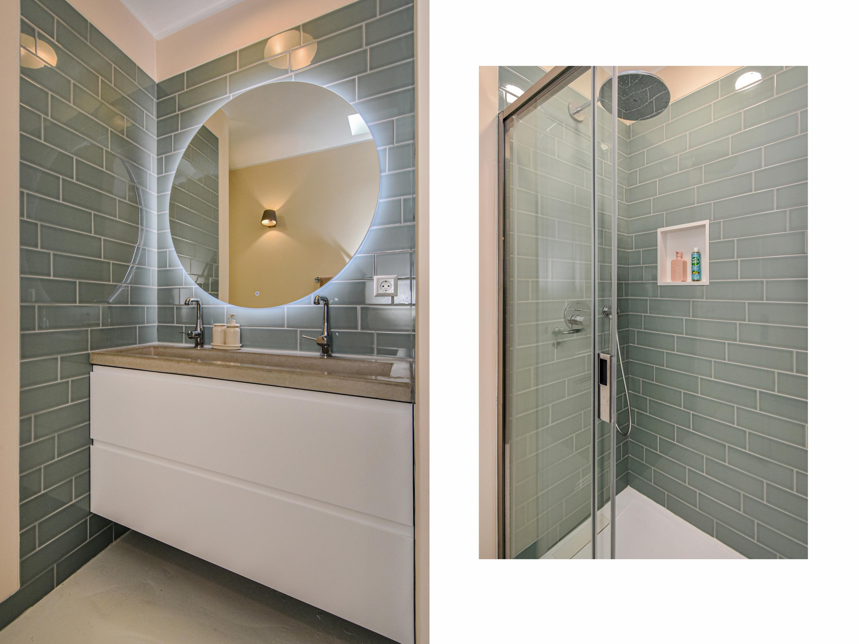 The landing provides access to a separate toilet with washbasin and additional storage space. The spacious and bright front bedroom features a high ceiling and a beautiful view over the canal. There are two additional large bedrooms, one with a walk-in shower and washbasin. All bedrooms are adorned with stained-glass windows. A separate laundry room gives access to the roof garden—a delightful, sheltered spot with optimal sunlight. From early morning until late evening, you can enjoy the sun, privacy, and a charming green setting. The terrace also includes a large wooden storage shed.
