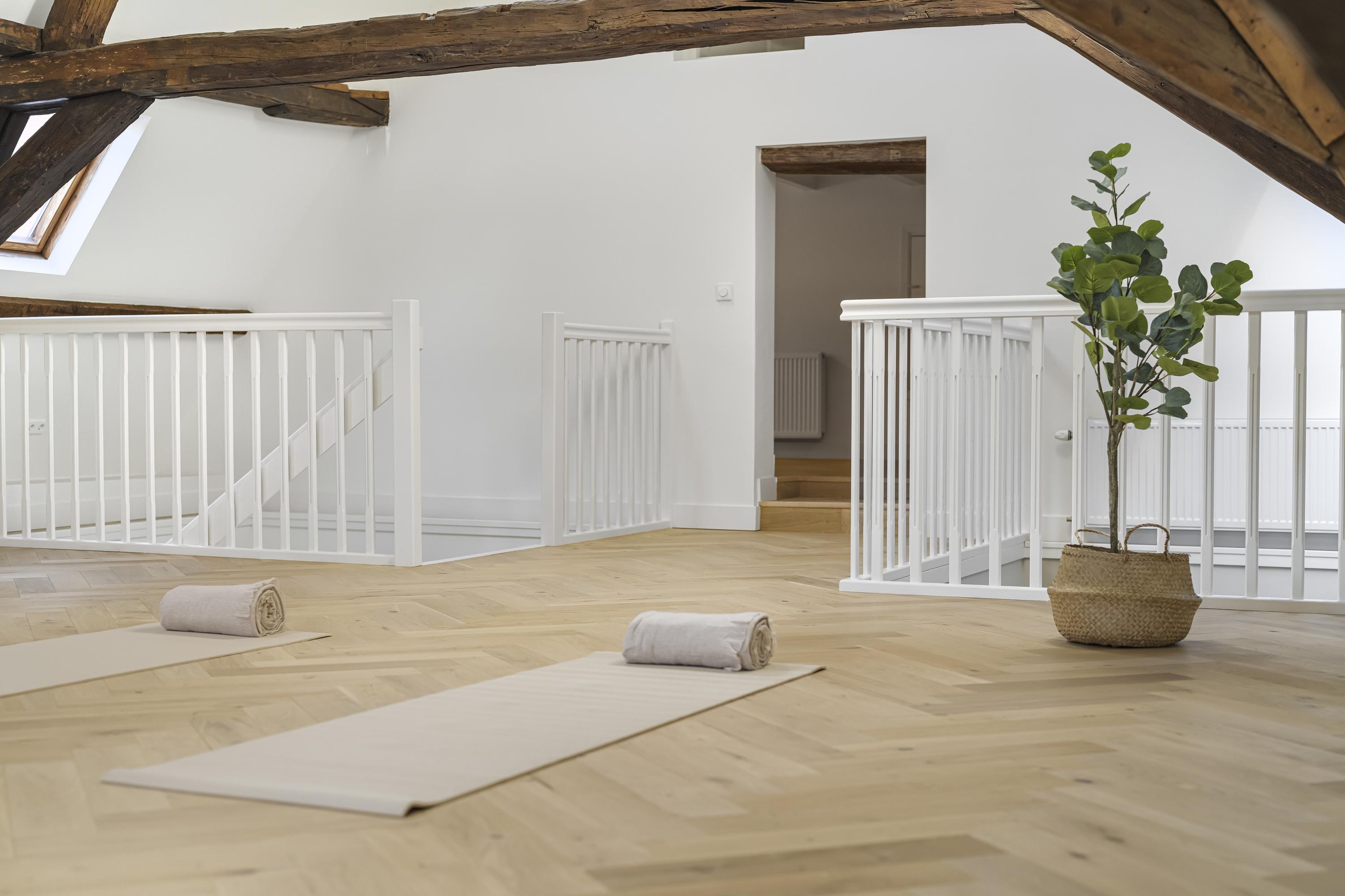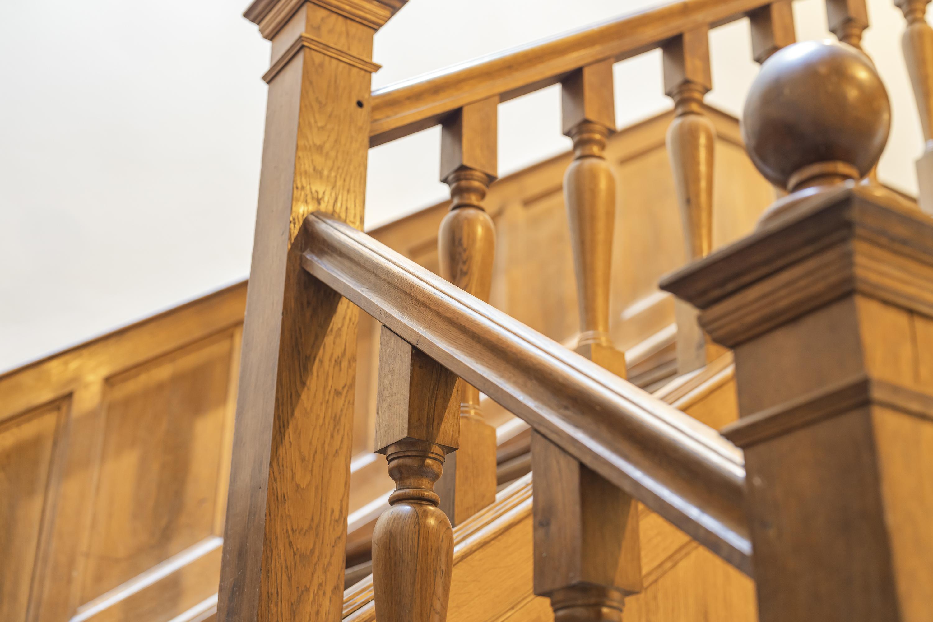 Newly installed herringbone parquet flooring on the ground and upper floors